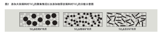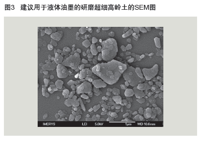 因此,當(dāng)PVC為30%時(shí),降低鈦白粉用量,配制白色液體油 墨,獲得總體不透明度最佳還是有可能的。該方法已成功應(yīng)用于 高光/半光涂料,適當(dāng)降低PVC含量,使用礦物填料優(yōu)化鈦白粉含量和不透明性(舉例參見(jiàn)文獻(xiàn)[5-8])。據(jù)報(bào)道,與粗顆粒和塊狀顆 粒相比,具有層狀結(jié)構(gòu)的細(xì)礦物顆粒(如高嶺土)更加有效,具 體效果見(jiàn)圖2所示,這種層狀顆粒可改善不透明度的原因在于TiO2 聚集體[9]較少,TiO2顆粒的吸收和粗糙效果[8]和TiO2顆粒可能被間 隔,不過(guò)文獻(xiàn)中對(duì)所述效果仍存在不同觀點(diǎn)[10]。因此,本研究重 點(diǎn)是使用超細(xì)高嶺土優(yōu)化高TiO2含量的水性柔版印刷油墨配方,旨 在保持光澤和不透明度不變。