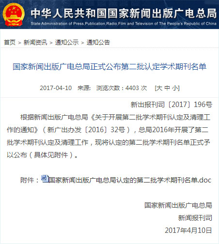 國家新聞出版廣電總局正式公布第二批認定學(xué)術(shù)期刊名單