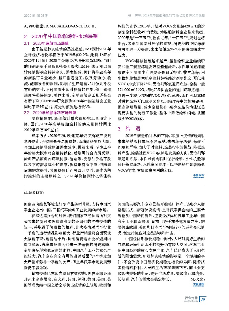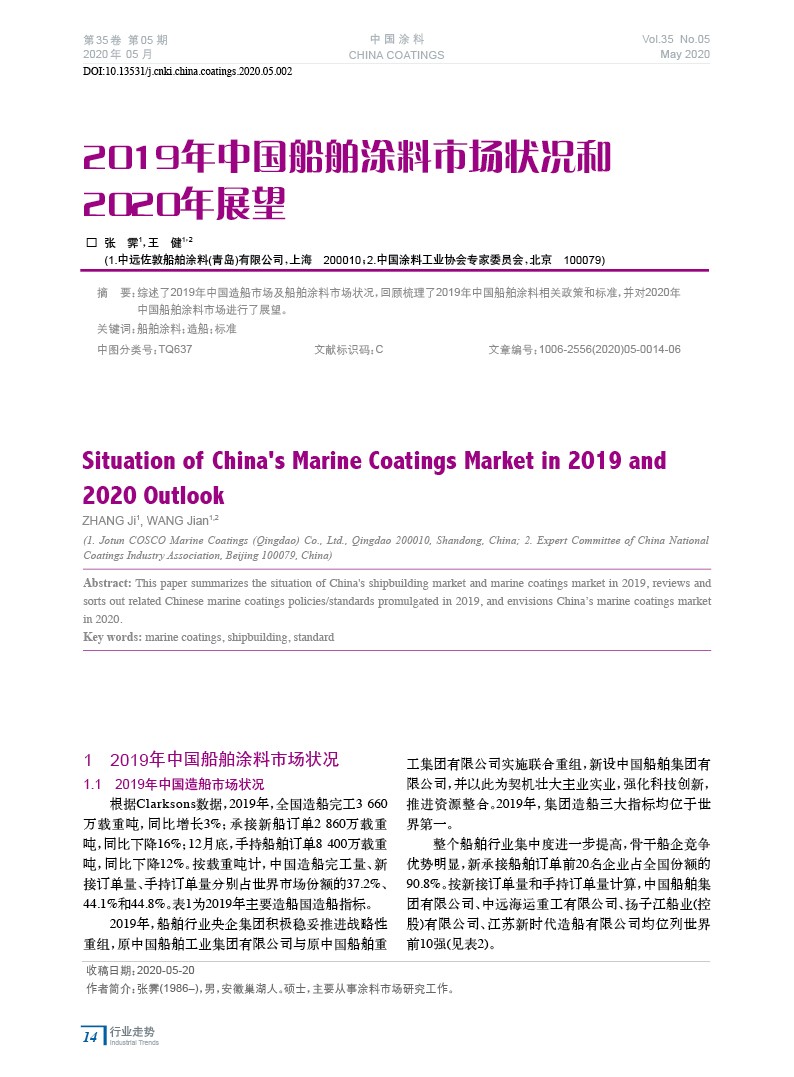 摘要:綜述了2019年中國造船市場及船舶涂料市場狀況,回顧梳理了2019年中國船舶涂料相關(guān)政策和標(biāo)準(zhǔn),并對2020年中國船舶涂料市場進行了展望。