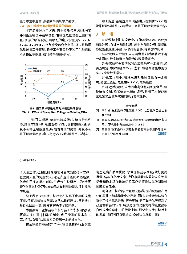 摘要:對新能源汽車配套充電裝置上應用的砂紋粉末涂料進行了制備和應用研究,重點考察了在厚涂的要求下,通過電荷調(diào)整劑加量、磨粉粒徑分布、噴涂參數(shù)控制3個方面的分析和討論,得到了穩(wěn)定的涂裝砂紋效果,克服了工件邊角靜電花、堆積坑的弊病問題,在客戶處成功應用。