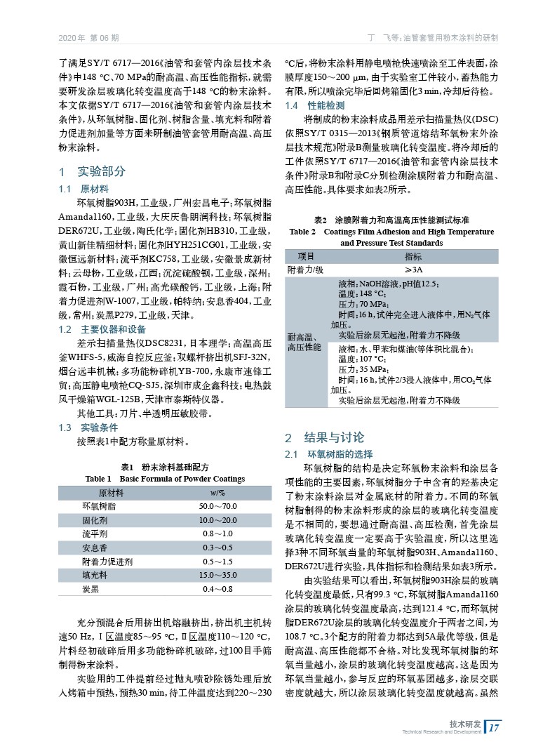 摘要:以SY/T 6717—2016《油管和套管內涂層技術條件》為依據,結合SY/T 0315—2013《鋼質管道熔結環氧粉末外涂層技術規范》的相關檢測方法,通過探討環氧樹脂、固化劑、樹脂含量、填料和助劑等對涂膜性能的影響,從而研制出了耐高溫、高壓以及各項性能指標均符合標準要求的粉末涂料。