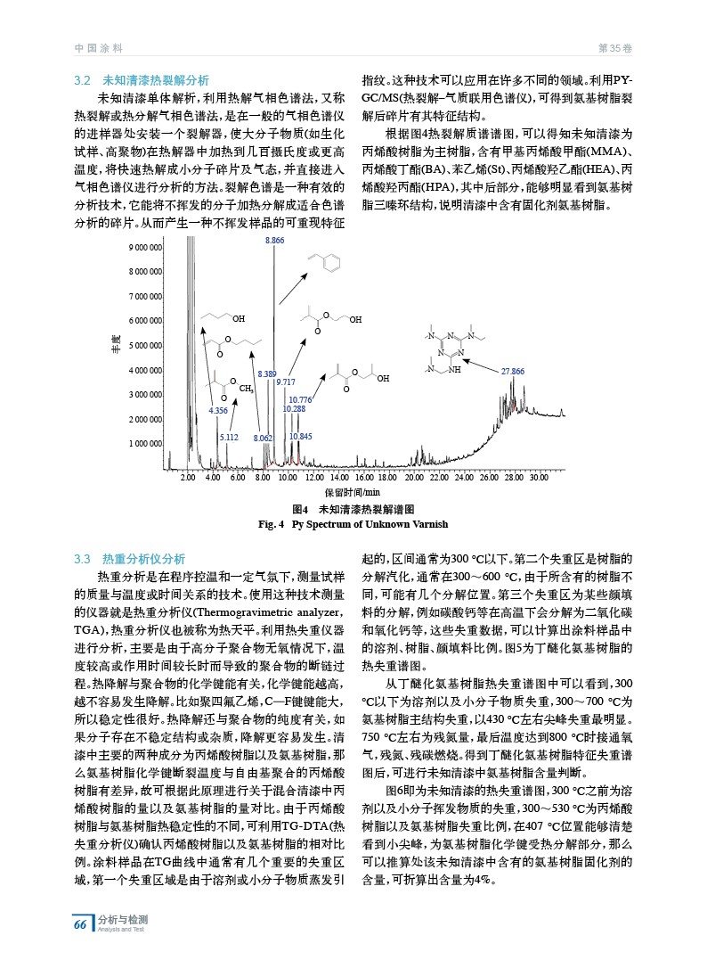 摘要:闡述了清漆產品中氨基樹脂固化劑結構以及含量的分析方法,采用儀器分析綜合手段對清漆中氨基樹脂固化劑進行定性、定量綜合分析,利用紅外光譜以及熱裂解–氣質聯用色譜分析儀對氨基樹脂種類以及結構進行確認,利用熱失重分析儀對氨基樹脂在清漆中含量進行確認,最終能夠實現未知清漆中固化劑含量確認。