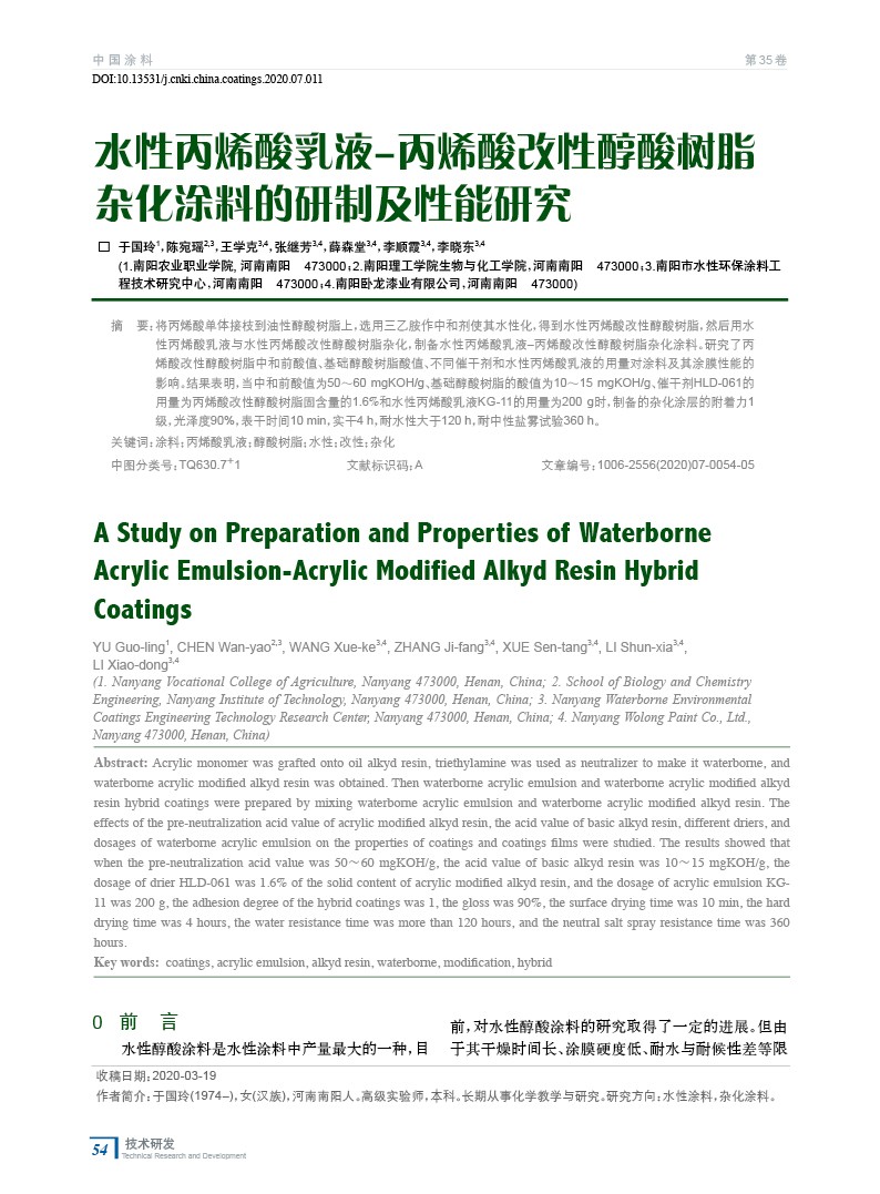 水性丙烯酸乳液?丙烯酸改性醇酸樹脂雜化涂料的研制及性能研究