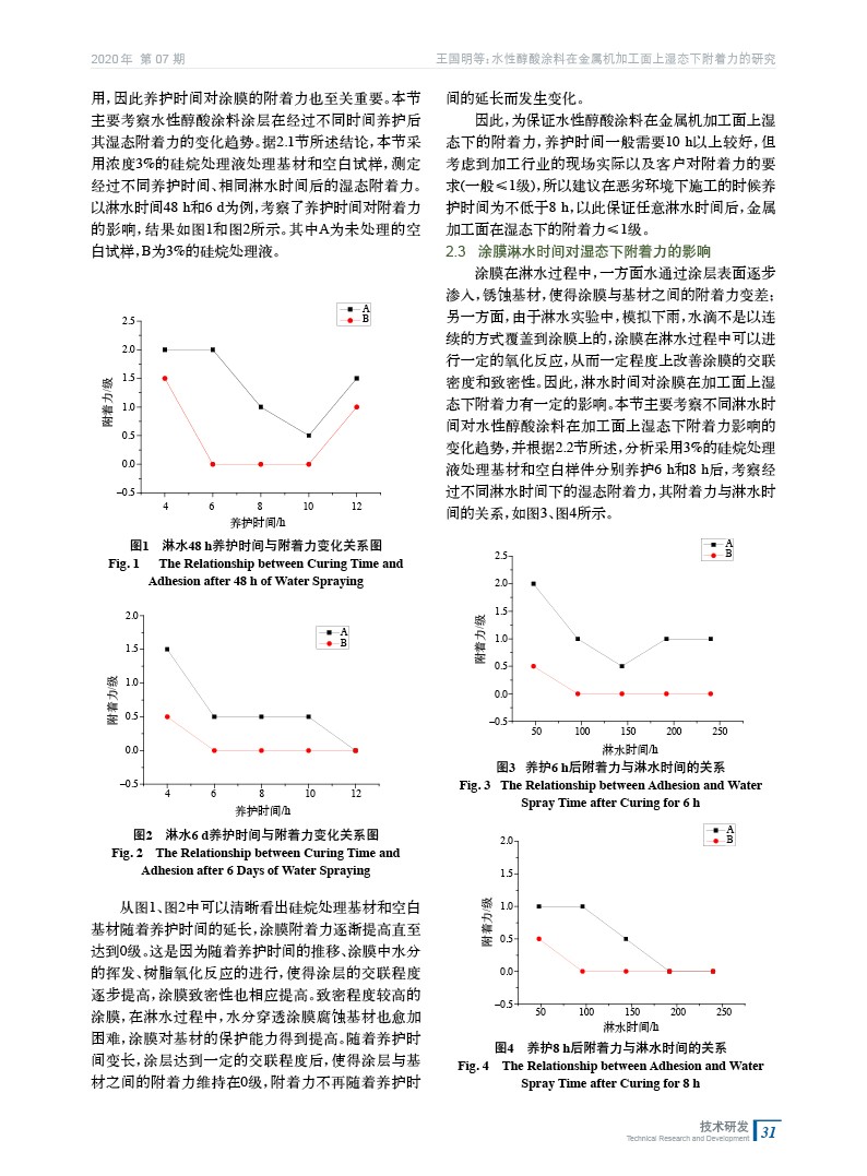 摘要:以自制的水性醇酸涂料為涂層,金屬機加工面為基材,討論了基材處理劑、養護時間、淋水時間對涂層在金屬加工面上濕態下附著力的影響。采用濃度為3%的硅烷處理液處理基材能夠有效地提高涂層在金屬加工面上的附著力;隨著養護時間和淋水時間的延長,能夠在一定程度上改善水性醇酸涂料在金屬加工面上的濕態附著力較差的現象。