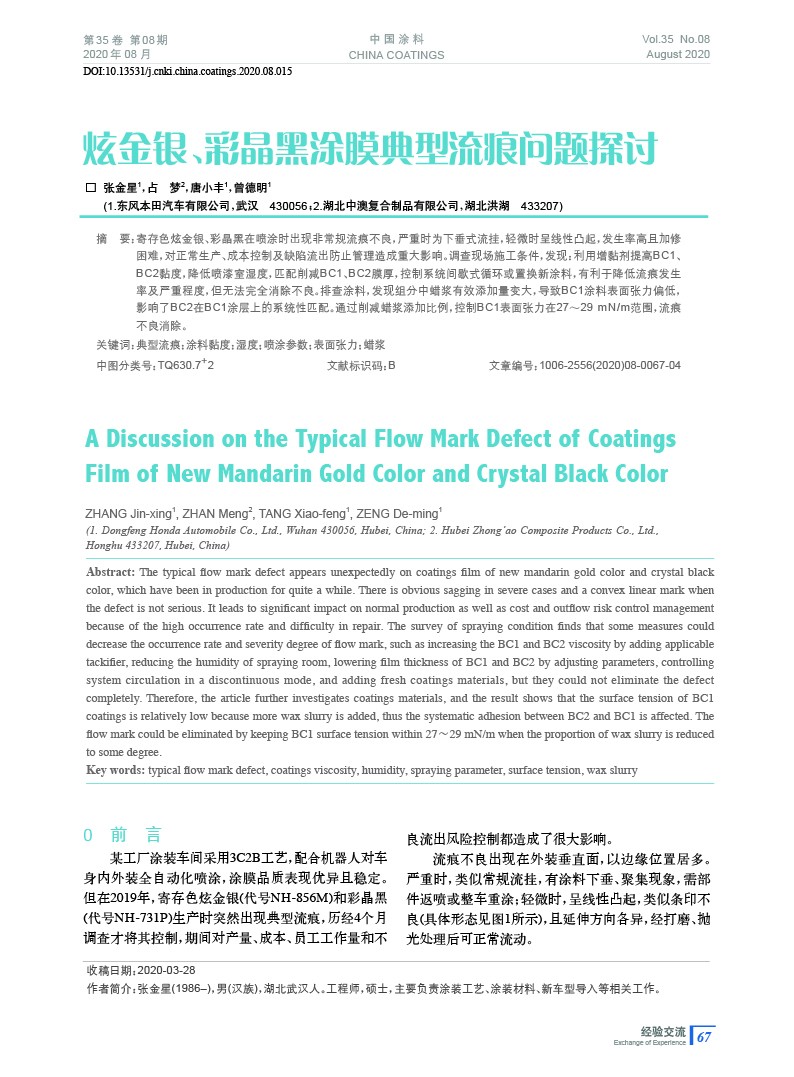 摘要:寄存色炫金銀、彩晶黑在噴涂時出現非常規流痕不良,調查現場施工條件,發現:利用增黏劑提高BC1、BC2黏度,降低噴漆室濕度,匹配削減BC1、BC2膜厚,控制系統間歇式循環或置換新涂料,有利于降低流痕發生率及嚴重程度,但無法完全消除不良。排查涂料,通過削減蠟漿添加比例,控制BC1表面張力在27~29 mN/m范圍,流痕不良消除。