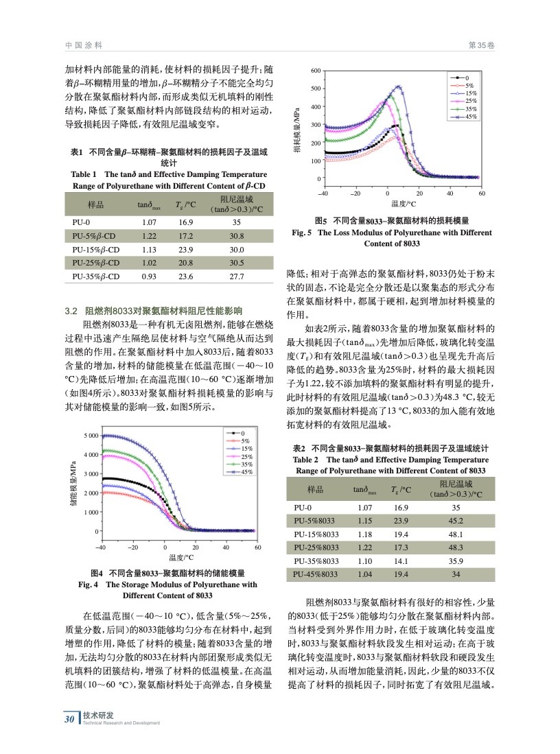 摘要:通過在聚氨酯材料中加入β−環糊精、阻燃劑8033、受阻酚AO-80等有機填料,并測試材料的動態力學性能,考察有機填料種類及用量對聚氨酯材料阻尼性能影響。β−環糊精的加入能夠提高聚氨酯材料的損耗因子,但會降低材料的有效阻尼溫域;阻燃劑8033不僅能提高聚氨酯材料的損耗因子,還能拓寬材料的有效阻尼溫域;受阻酚AO-80能夠有效提高聚氨酯材料的損耗因子。