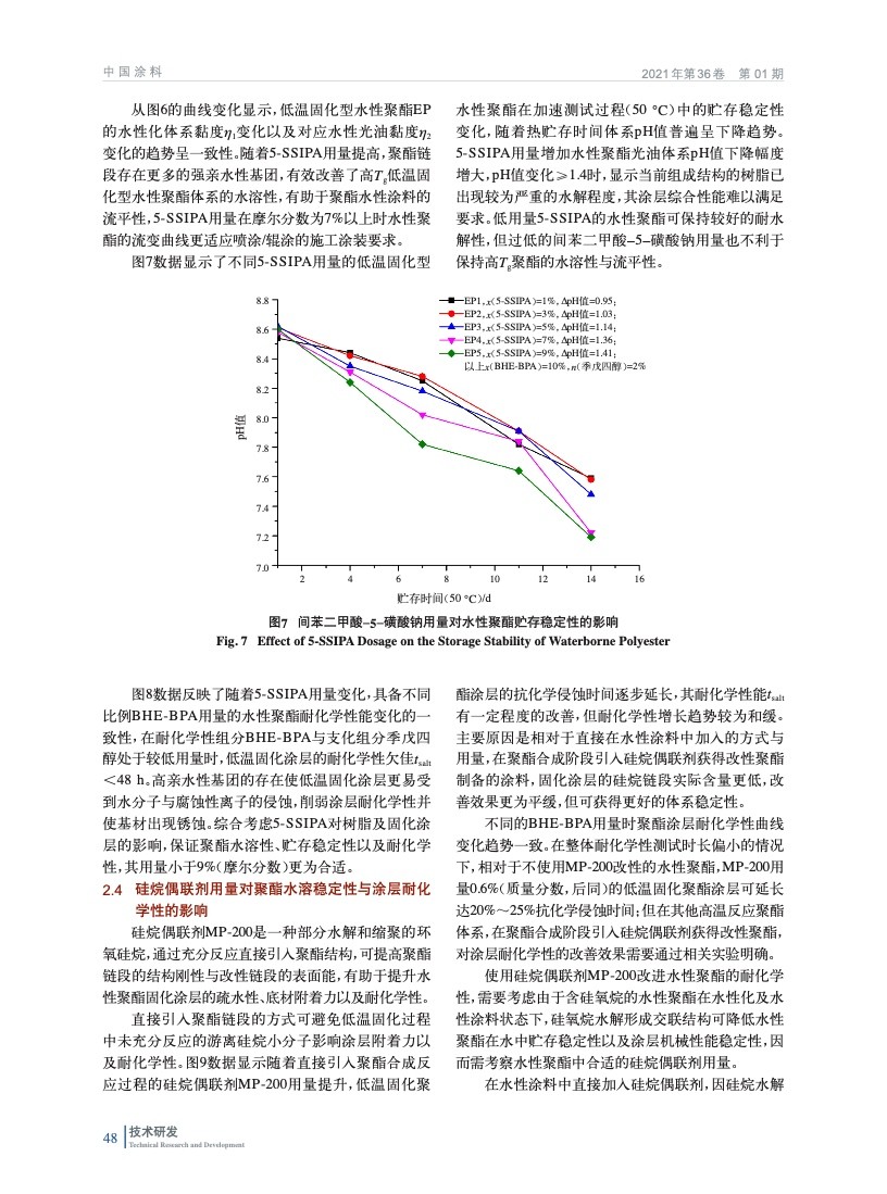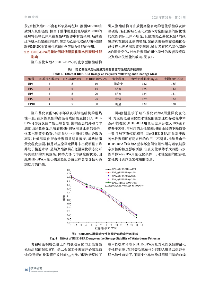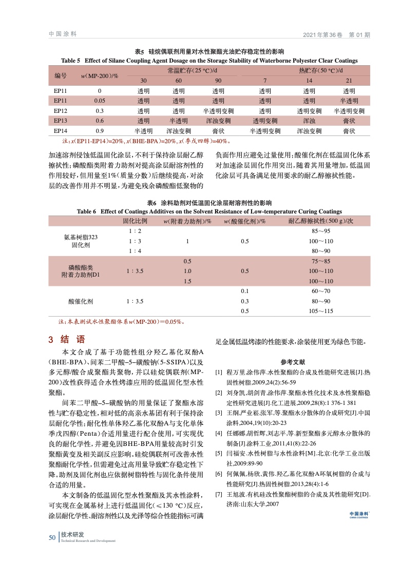 摘要:基于功能性組分羥乙基化雙酚A,間苯二甲酸-5-磺酸鈉以及多元醇/酸合成聚酯共聚物,并以硅烷偶聯(lián)劑改性獲得適合低溫固化型水性烤漆的水性聚酯;研究了羥乙基化雙酚A,間苯二甲酸-5-磺酸鈉,支化組分以及硅烷偶聯(lián)劑對性能的影響;同時考察了涂料助劑對低溫固化涂層性能的合適用量。
