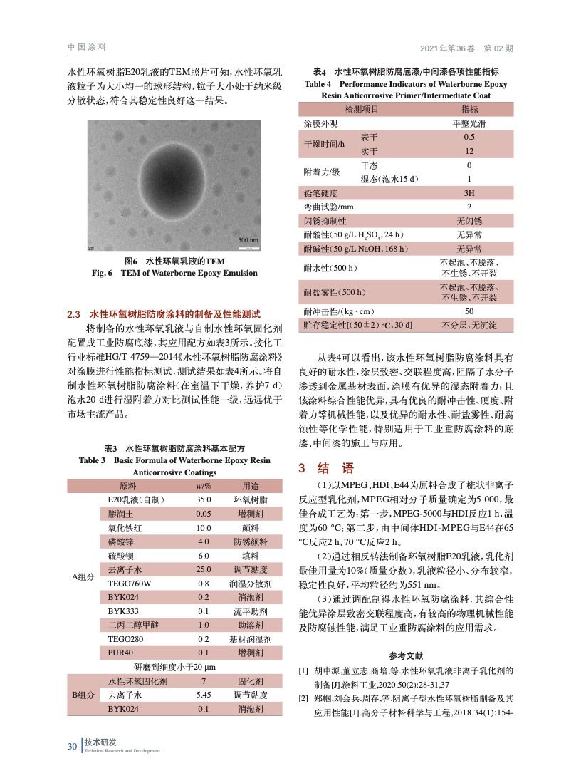 摘要:以聚乙二醇單甲醚、六亞甲基二異氰酸酯、環氧樹脂為原料合成了一種非離子反應型環氧乳化劑,并通過相反轉法制備水性環氧樹脂E20乳液。對乳化劑結構和乳液形貌及其粒徑分布進行表征。確定了乳化劑采用兩步法合成,反應溫度為逐步升溫模式,MPEG相對分子質量為5 000,乳化劑質量分數為10%,所制得的水性環氧樹脂E20乳液平均粒徑為551 nm,穩定性良好,且制得的乳液涂膜固化物具有優良的耐水防腐蝕性能。