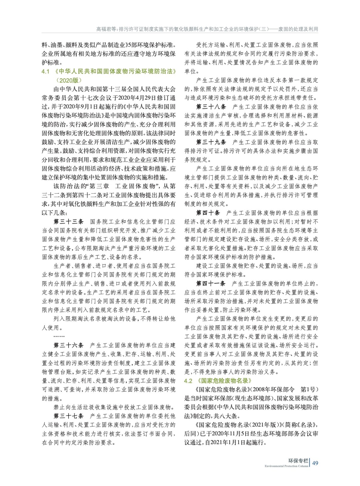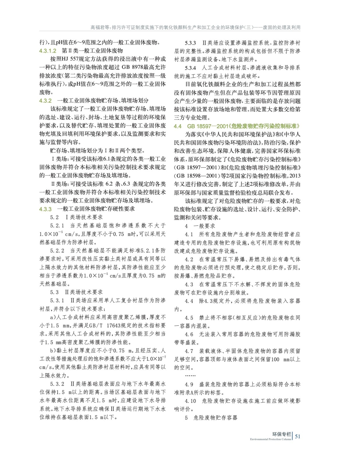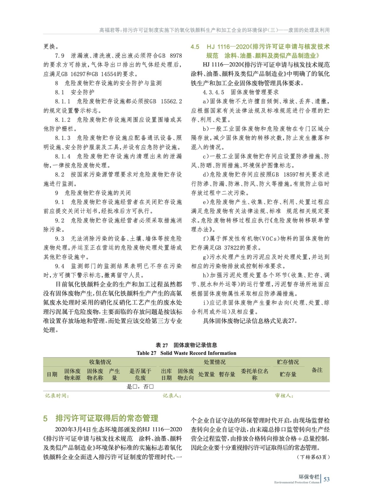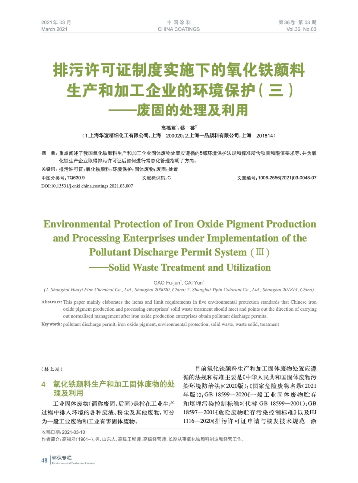 摘要:重點闡述了我國氧化鐵顏料生產(chǎn)和加工企業(yè)固體廢物處置應(yīng)遵循的5部環(huán)境保護法規(guī)和標(biāo)準(zhǔn)所含項目和限值要求等,并為氧化鐵生產(chǎn)企業(yè)取得排污許可證后如何進行常態(tài)化管理指明了方向。