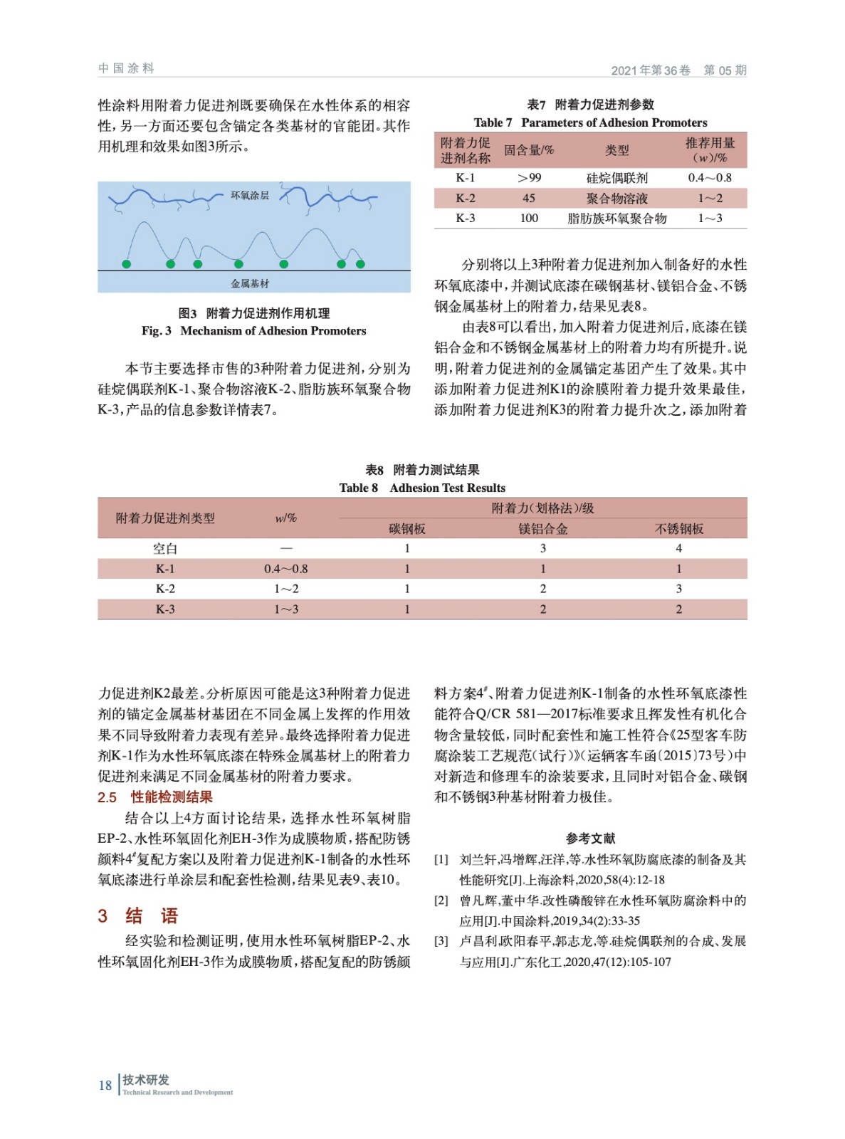 摘要:通過對樹脂、固化劑、防銹顏料和附著力促進劑的篩選,制備了應(yīng)用于軌道交通客車車輛防腐的水性環(huán)氧底漆。其性能符合Q/CR 581—2017《鐵路客車用涂料技術(shù)條件》,該底漆VOCs含量較低,耐鹽霧性佳,具備極佳的環(huán)境友好性能和防腐性能;在碳鋼、不銹鋼、鋁合金3種底材上的附著力極好;與原子灰膩子的配套性極佳,是軌道交通客車配套涂裝應(yīng)用中VOCs減排、防腐蝕的優(yōu)選產(chǎn)品。
