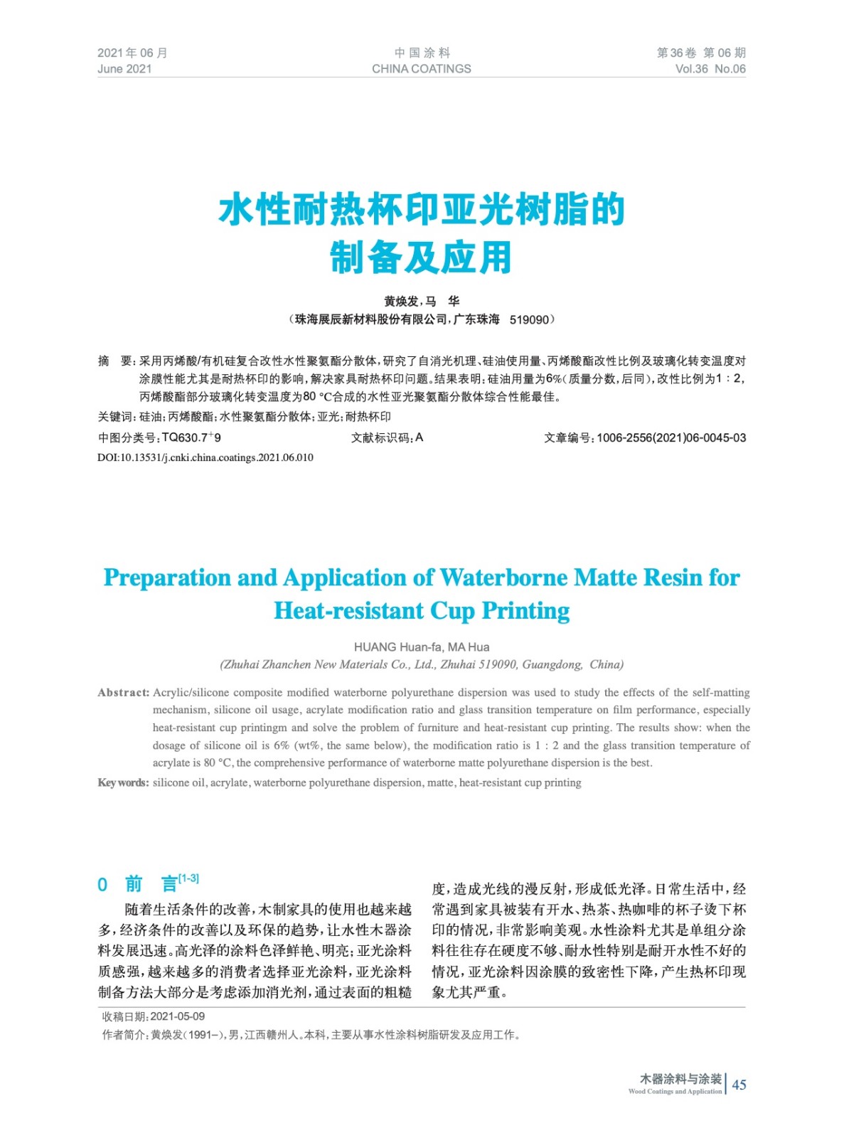 摘要:采用丙烯酸/有機硅復合改性水性聚氨酯分散體,研究了自消光機理、硅油使用量、丙烯酸酯改性比例及玻璃化轉變溫度對涂膜性能尤其是耐熱杯印的影響,解決家具耐熱杯印問題。結果表明:硅油用量為6%,改性比例為1∶2,丙烯酸酯部分玻璃化轉變溫度為80 ℃合成的水性亞光聚氨酯分散體綜合性能最佳。