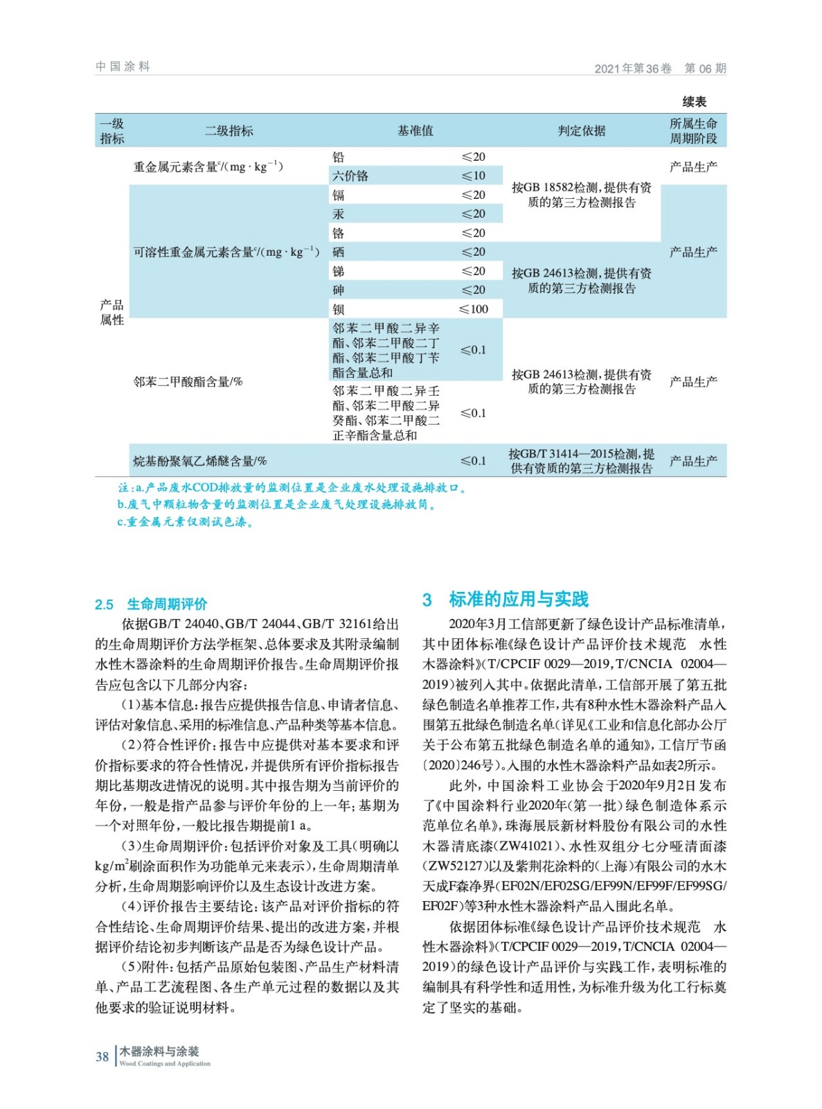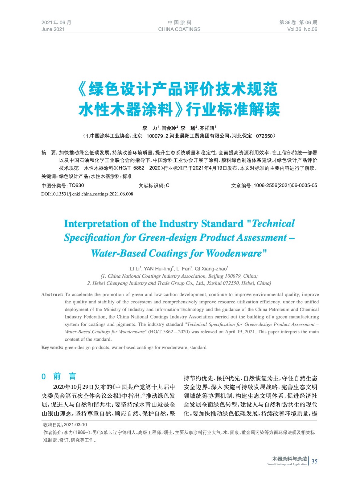 摘要:加快推動綠色低碳發(fā)展,持續(xù)改善環(huán)境質(zhì)量,提升生態(tài)系統(tǒng)質(zhì)量和穩(wěn)定性,全面提高資源利用效率,在工信部的統(tǒng)一部署以及中國石油和化學工業(yè)聯(lián)合會的指導(dǎo)下,中國涂料工業(yè)協(xié)會開展了涂料、顏料綠色制造體系建設(shè)。《綠色設(shè)計產(chǎn)品評價技術(shù)規(guī)范 水性木器涂料》(HG/T 5862—2020)行業(yè)標準已于2021年4月19日發(fā)布,本文對標準的主要內(nèi)容進行了解讀。
