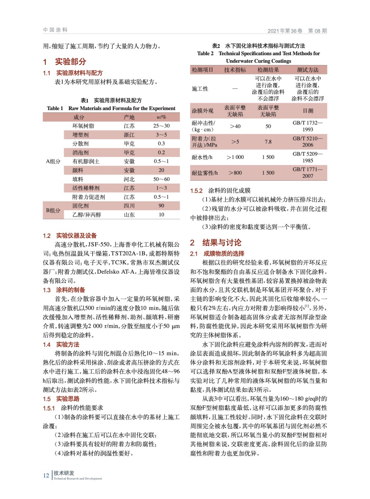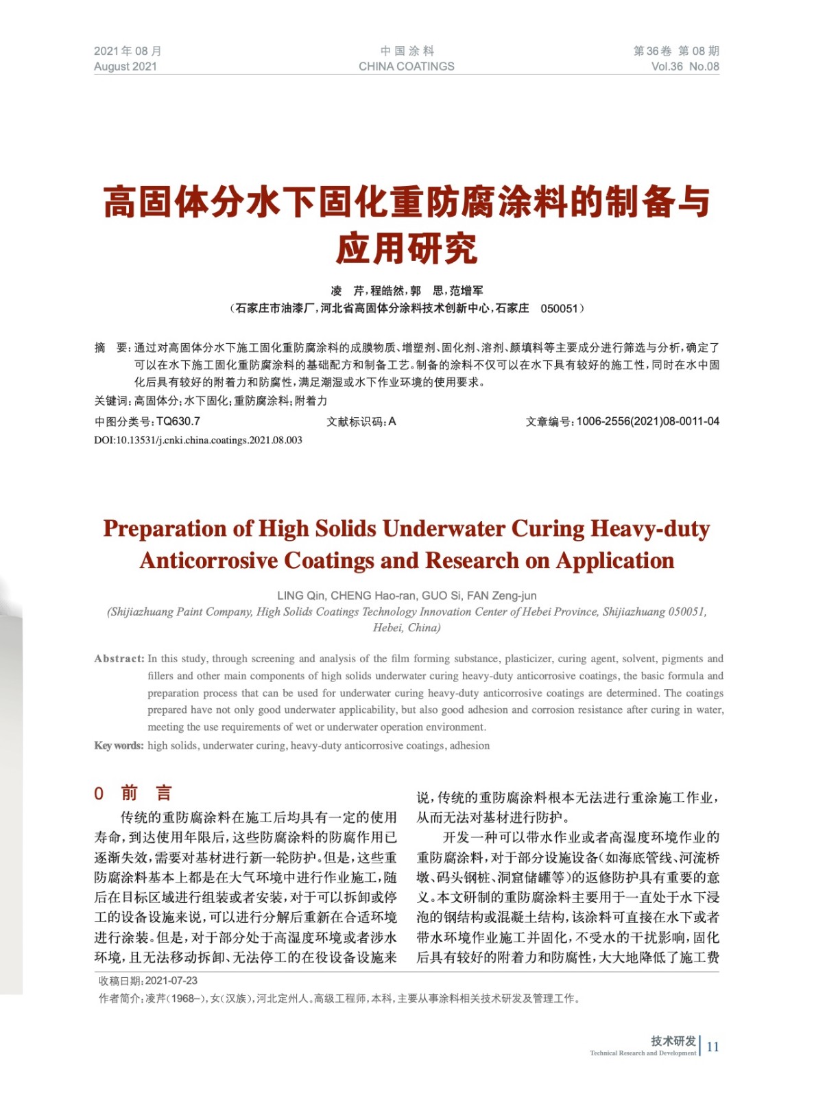 摘要:通過對高固體分水下施工固化重防腐涂料的成膜物質、增塑劑、固化劑、溶劑、顏填料等主要成分進行篩選與分析,確定了可以在水下施工固化重防腐涂料的基礎配方和制備工藝。制備的涂料不僅可以在水下具有較好的施工性,同時在水中固化后具有較好的附著力和防腐性,滿足潮濕或水下作業環境的使用要求。