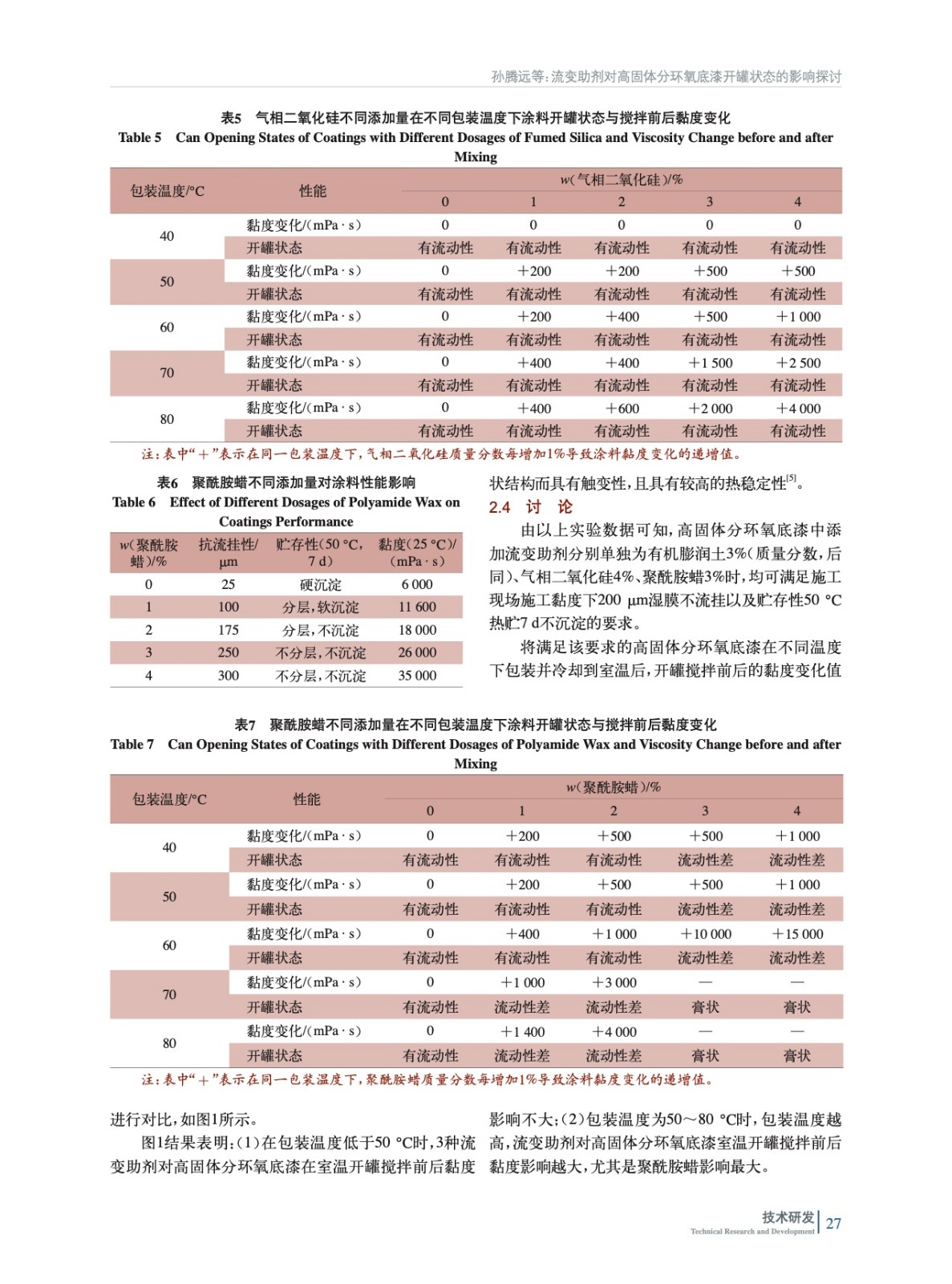 摘要:以高固體分環氧底漆為研究對象,考察了制備過程中聚酰胺蠟、氣相二氧化硅以及有機膨潤土3種流變助劑對其開罐狀態的影響。結果表明,在滿足性能前提下:(1)添加有機膨潤土或氣相二氧化硅的高固體分環氧底漆車間生產包裝時,包裝溫度對其開罐攪拌前后黏度變化影響較小,開罐狀態較好;(2)包裝溫度越高,添加聚酰胺蠟的高固體分環氧底漆開罐攪拌前后黏度變化越大,即包裝溫度越高,開罐狀態越差。