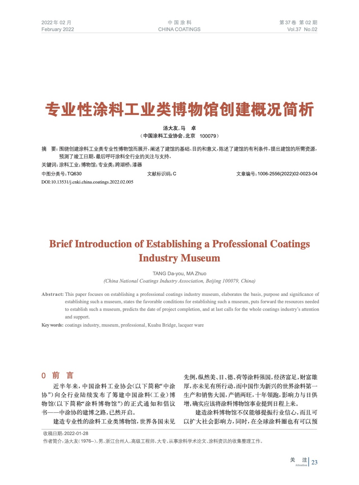 圍繞創建涂料工業類專業性博物館而展開,闡述了建館的基礎、目的和意義,陳述了建館的有利條件,提出建館的所需資源,預測了竣工日期,最后呼吁涂料全行業的關注與支持。