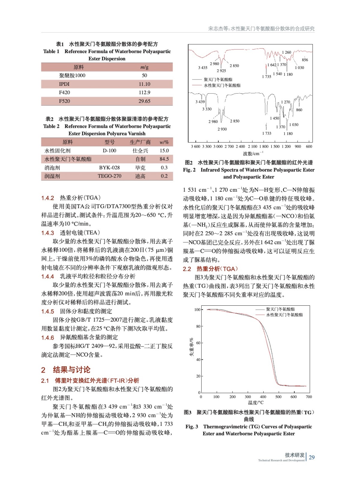 摘要:以聚天門冬氨酸酯樹脂、聚醚胺及二異氰酸酯為原料制備了水性聚天門冬氨酸酯分散體。使用紅外光譜、熱重分析、透射電鏡和激光粒度分析儀對樣品進行表征測試,結果表明:當二異氰酸酯選擇IPDI、n(聚天門冬氨酸酯F420)/n(聚天門冬氨酸酯F520)為4時,水性聚天門冬氨酸酯分散體狀態穩定,涂膜性能最好。