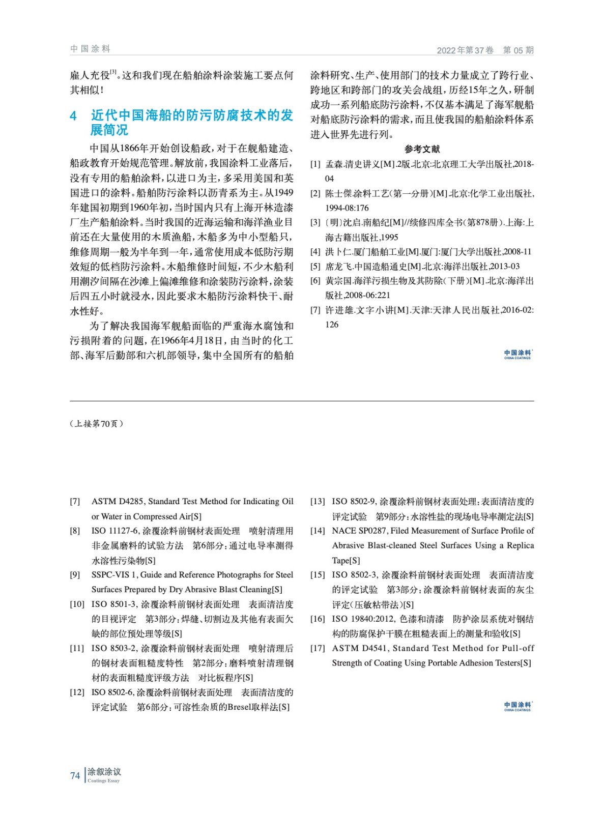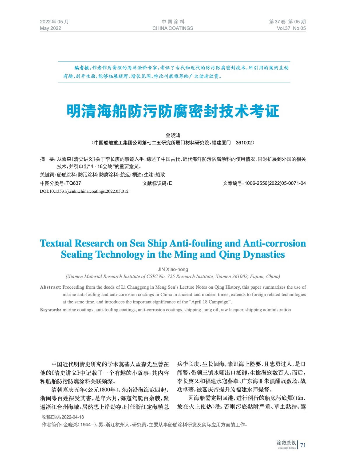 從孟森《清史講義》關于李長庚的事跡入手,綜述了中國古代、近代海洋防污防腐涂料的使用情況,同時擴展到外國的相關技術,并引申出“4·18會戰”的重要意義。