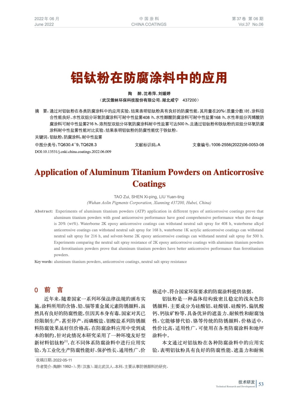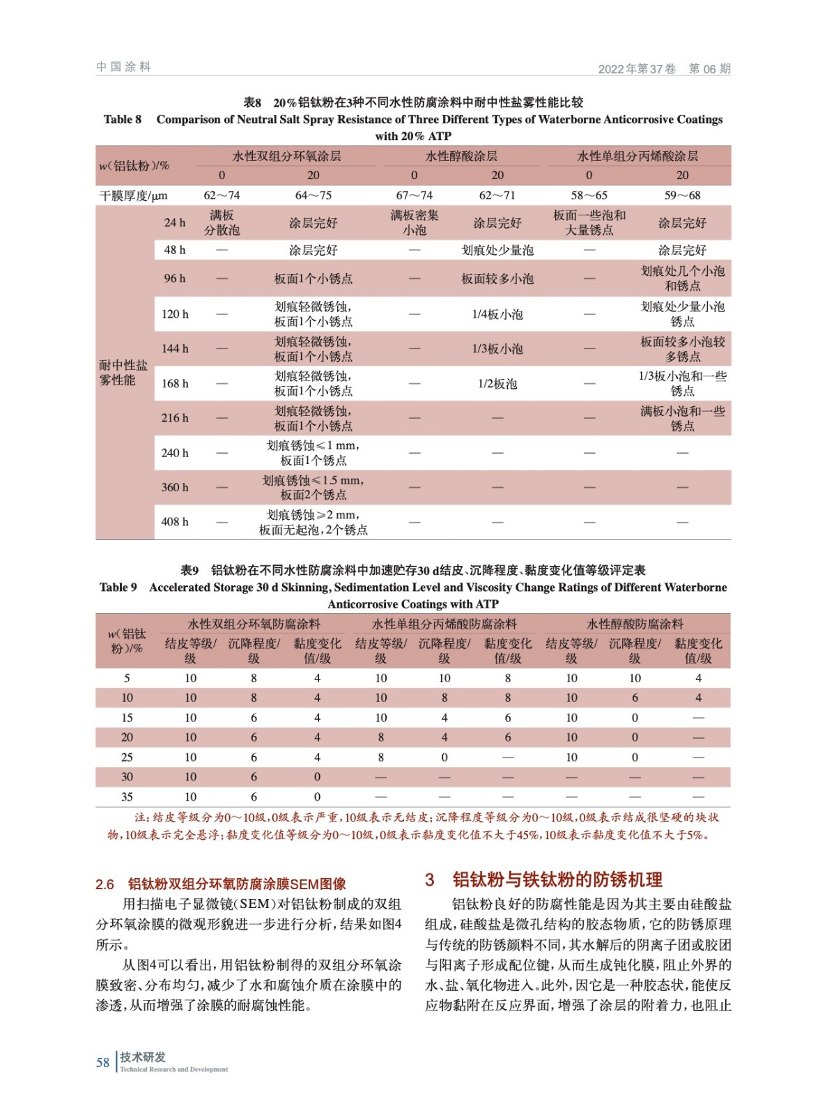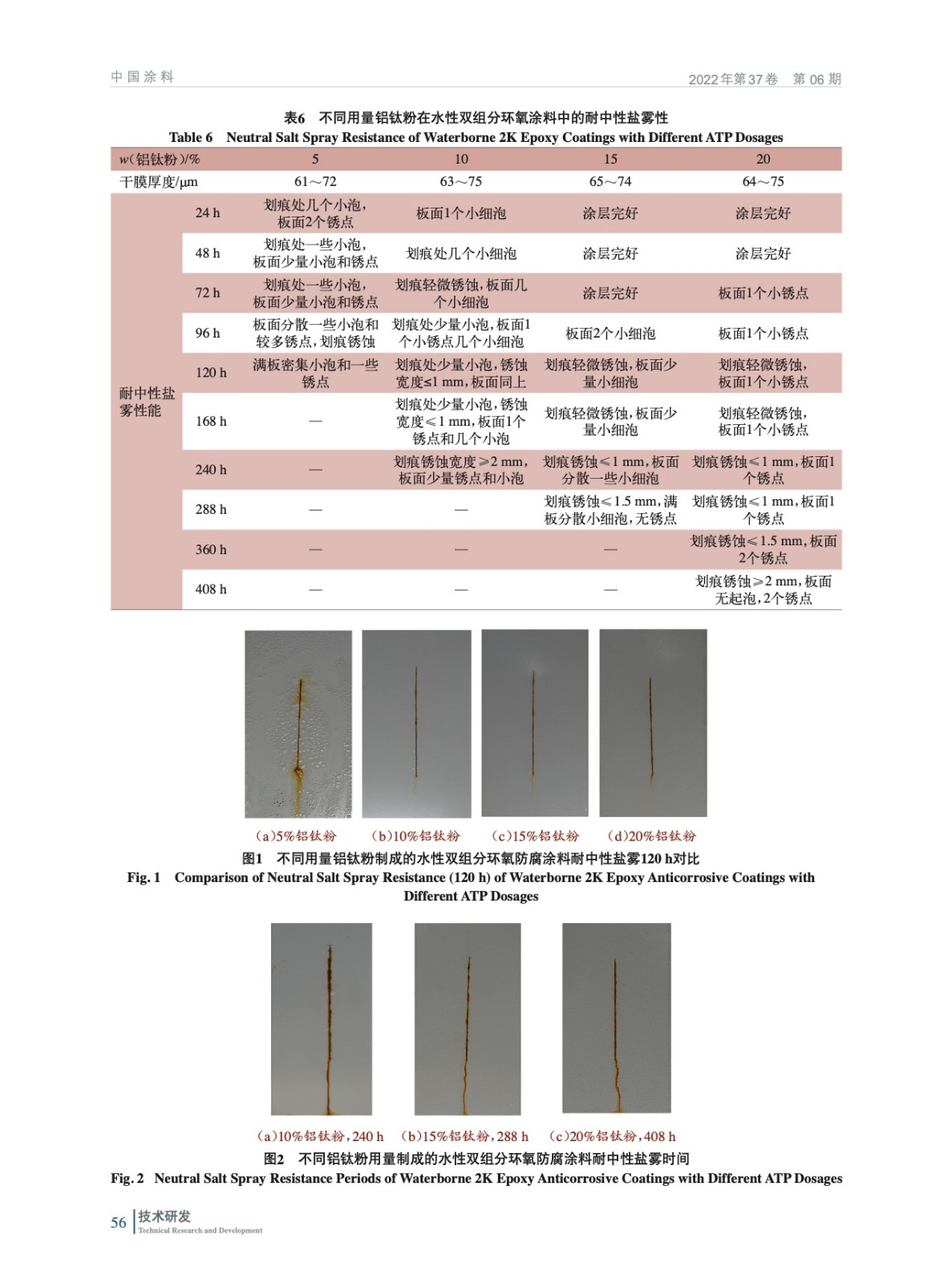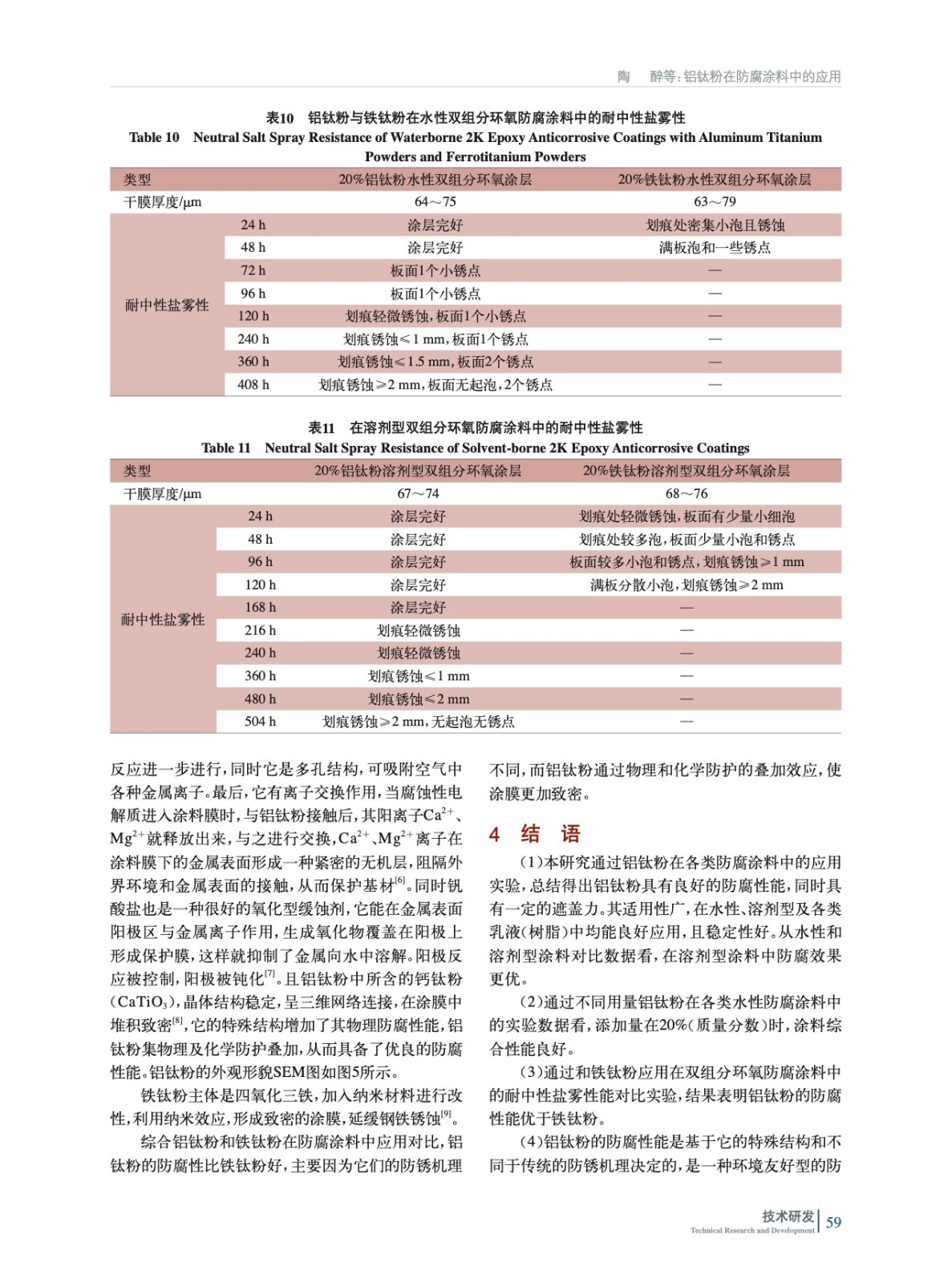 摘要:通過對鋁鈦粉在各類防腐涂料中的應用實驗,結(jié)果表明鋁鈦粉具有良好的防腐性能,其用量在20%時,涂料綜合性能良好,水性雙組分環(huán)氧防腐涂料可耐中性鹽霧408 h,水性醇酸防腐涂料可耐中性鹽霧168 h,水性單組分丙烯酸防腐涂料中達216 h,溶劑型雙組分環(huán)氧防腐涂料中達500 h。且通過鋁鈦粉和鐵鈦粉的雙組分環(huán)氧防腐涂料耐中性鹽霧性能對比實驗,結(jié)果表明鋁鈦粉的防腐性更優(yōu)。