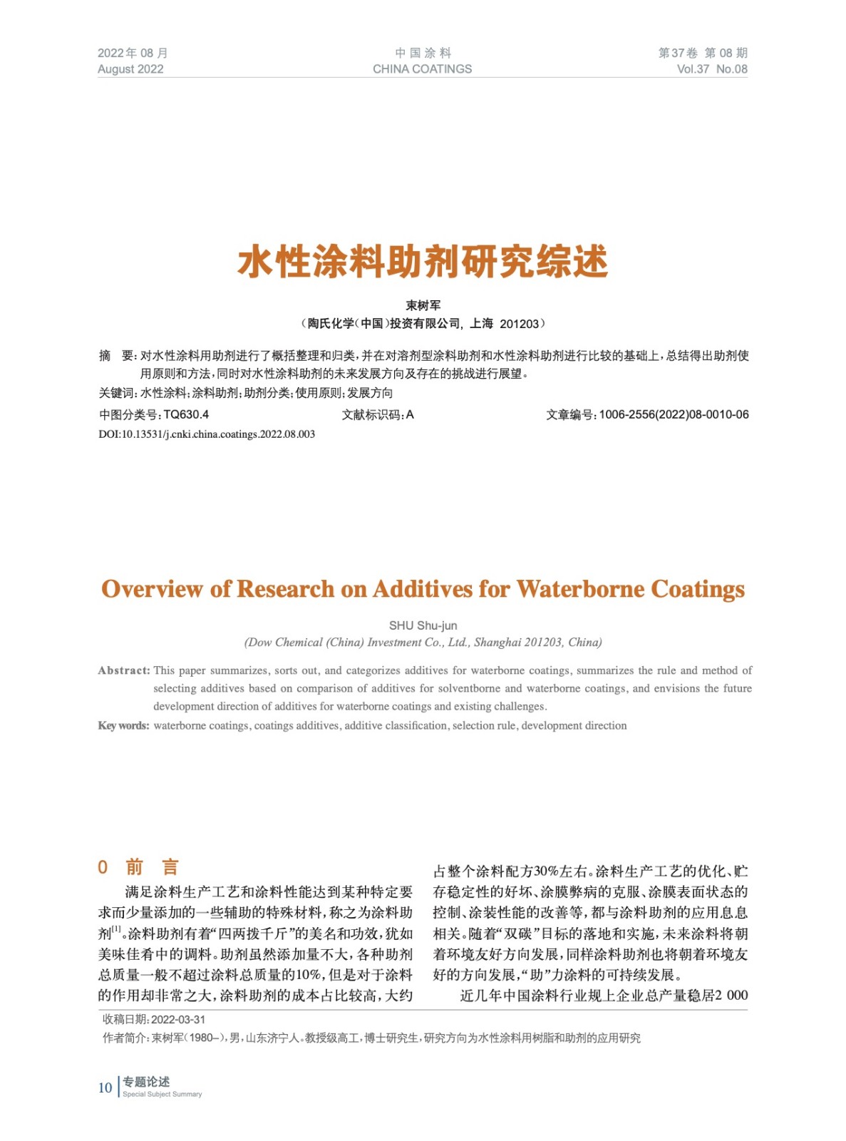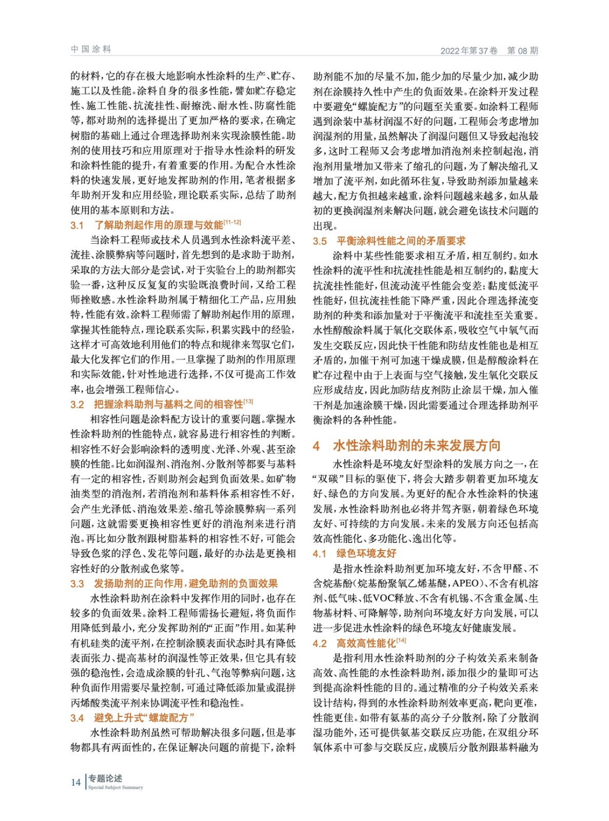 對水性涂料用助劑進行了概括整理和歸類,并在對溶劑型涂料助劑和水性涂料助劑進行比較的基礎上,總結得出助劑使用原則和方法,同時對水性涂料助劑的未來發展方向及存在的挑戰進行展望。
