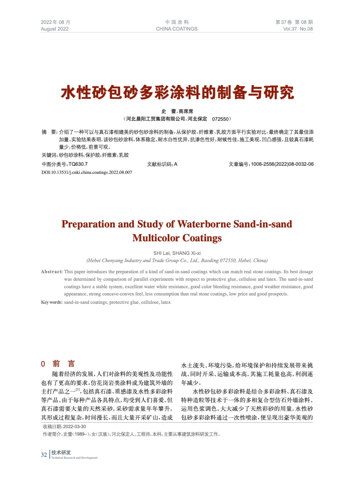 摘要:介紹了一種可以與真石漆相媲美的砂包砂涂料的制備,從保護膠、纖維素、乳膠方面平行實驗對比,最終確定了其最佳添加量。實驗結(jié)果表明,該砂包砂涂料,體系穩(wěn)定,耐水白性優(yōu)異,抗?jié)B色性好,耐候性佳,施工美觀,凹凸感強,且較真石漆耗量少,價格低,前景可觀。
