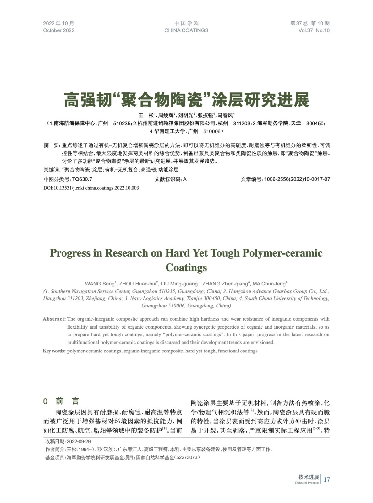摘要:重點綜述了通過有機–無機復(fù)合增韌陶瓷涂層的方法,即可以將無機組分的高硬度、耐磨蝕等與有機組分的柔韌性、可調(diào)控性等相結(jié)合,最大限度地發(fā)揮兩類材料的綜合優(yōu)勢,制備出兼具類聚合物和類陶瓷性質(zhì)的涂層,即“聚合物陶瓷”涂層。討論了多功能“聚合物陶瓷”涂層的最新研究進(jìn)展,并展望其發(fā)展趨勢。