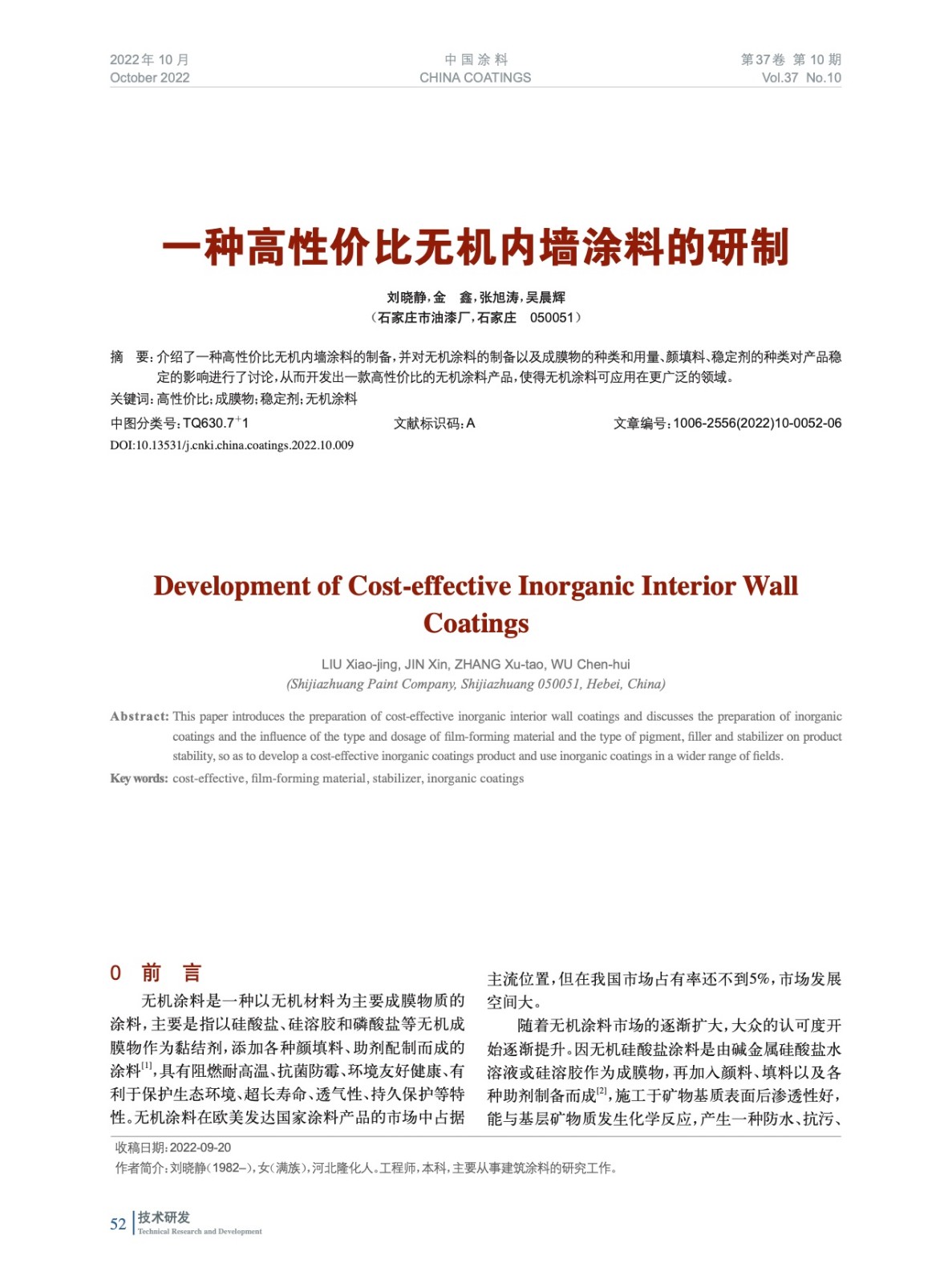 介紹了一種高性價比無機內墻涂料的制備,并對無機涂料的制備以及成膜物的種類和用量、顏填料、穩定劑的種類對產品穩定的影響進行了討論,從而開發出一款高性價比的無機涂料產品,使得無機涂料可應用在更廣泛的領域。