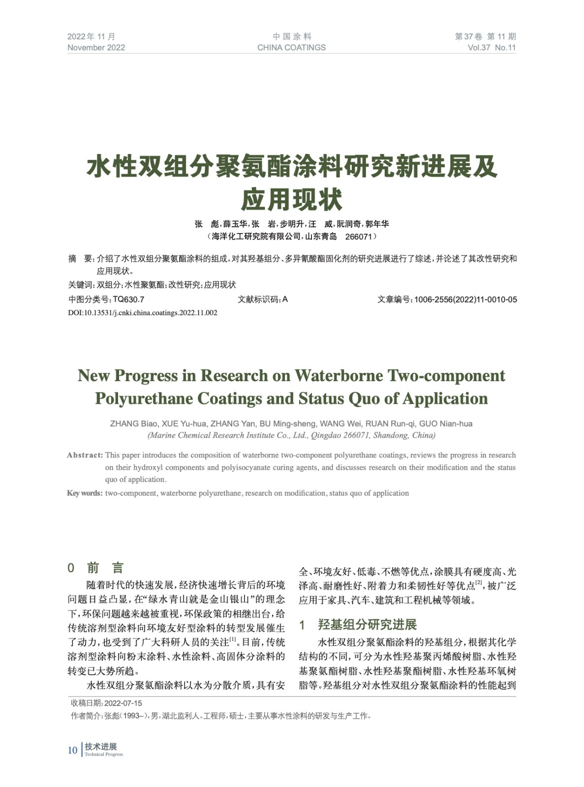 水性雙組分聚氨酯涂料研究新進(jìn)展及應(yīng)用現(xiàn)狀