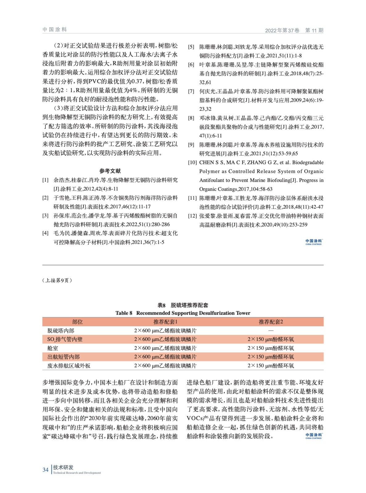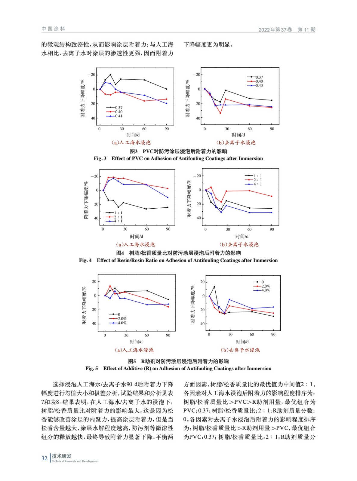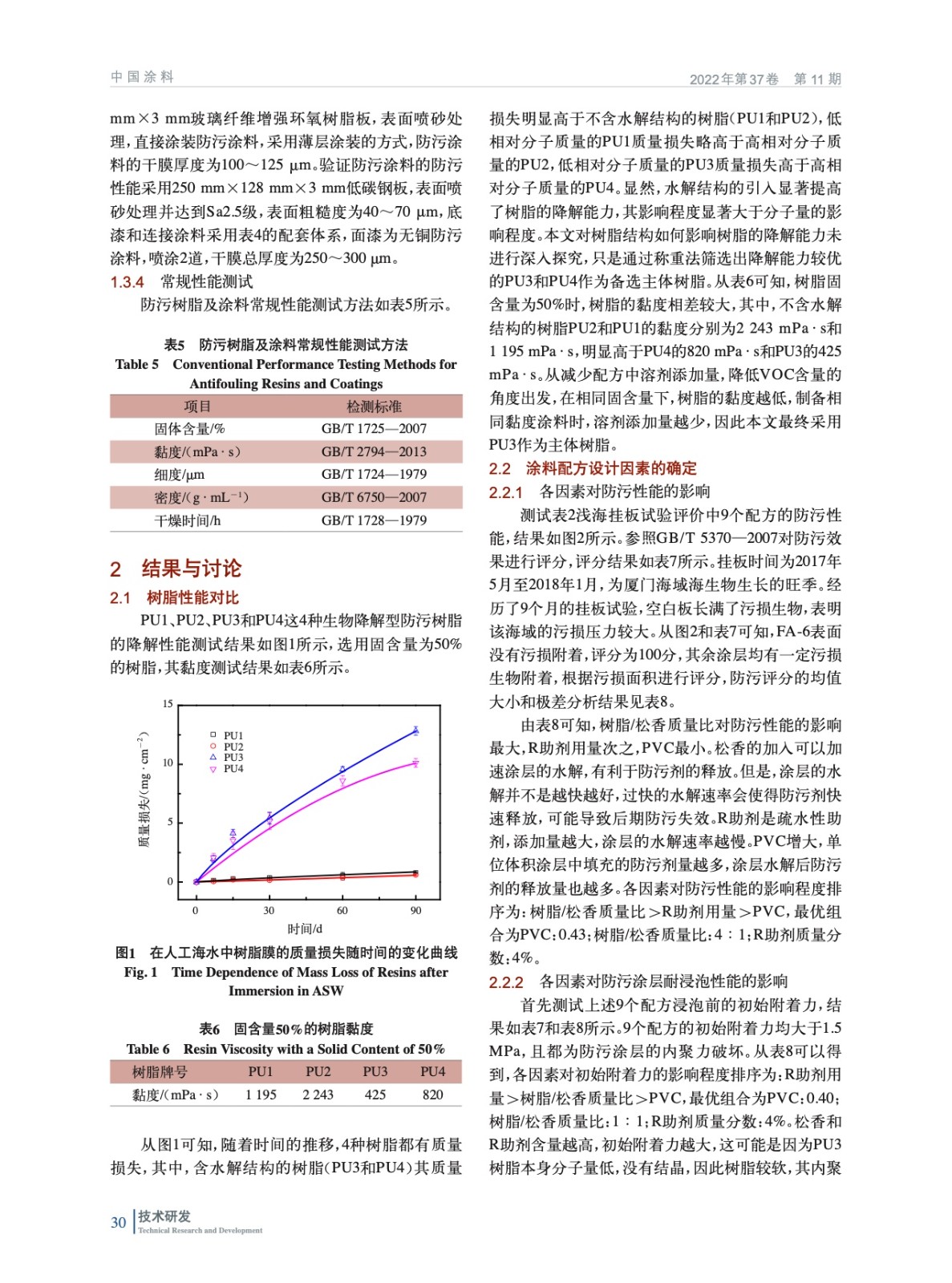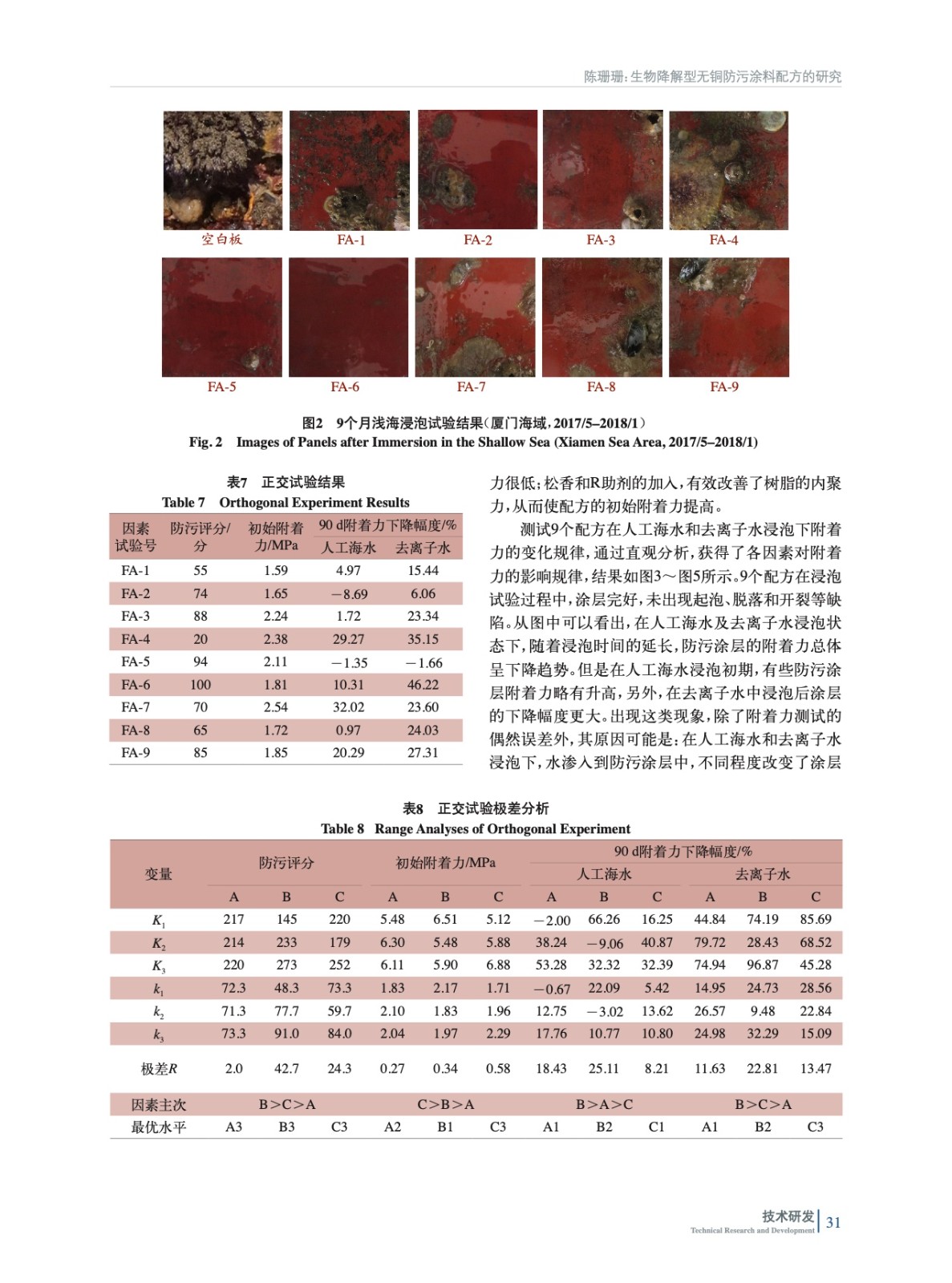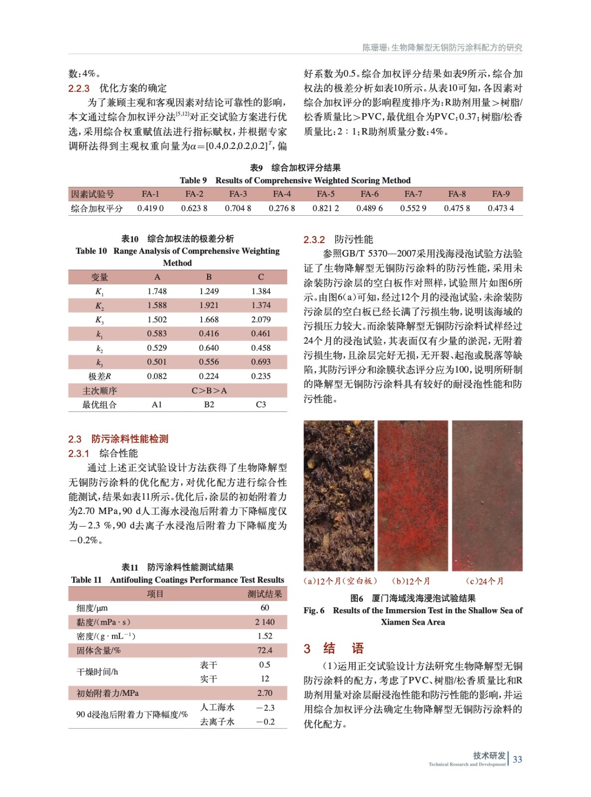 摘要:通過測定樹脂的固含量、黏度和降解性能篩選出綜合性能合適的生物降解型樹脂作為主體樹脂,并以防污效果較好的吡啶硫酮鋅/溴代吡咯腈(ZPT/Econea)復(fù)配防污劑作為主防污劑,運用正交試驗設(shè)計方法進行無銅防污涂料配方研究。通過淺海掛板試驗和浸泡人工海水/去離子水后涂層附著力的測試,研究顏料體積濃度(PVC)、樹脂/松香質(zhì)量比和滲出率調(diào)節(jié)助劑(R助劑)添加量對涂層防污性能和耐浸泡性能的影響,通過綜合加權(quán)評分法計算出配方中各因素的最優(yōu)值和各組分的最優(yōu)添加量。研究結(jié)果表明,當(dāng)配方中PVC為0.37、樹脂/松香質(zhì)量比為2∶1、R助劑質(zhì)量分數(shù)為4.0%時,涂層具有良好的耐浸泡性能。經(jīng)過24個月淺海掛板試驗驗證,涂層具有優(yōu)異的防污期效。通過正交試驗優(yōu)化得到的以PU3為主體樹脂的生物降解型無銅防污涂料具有良好的耐浸泡性能和防污效果。