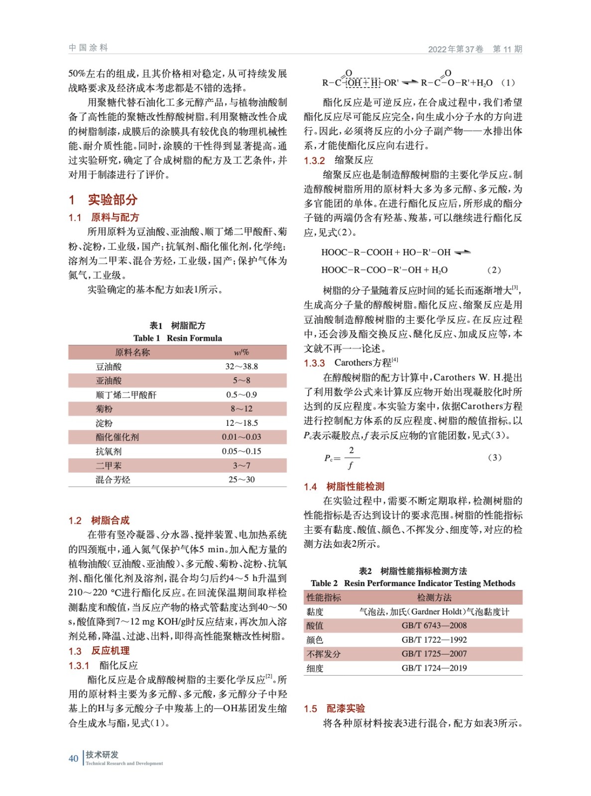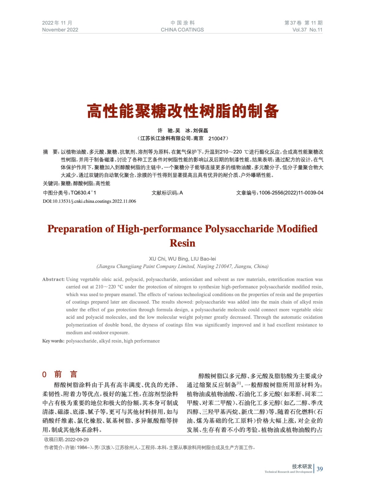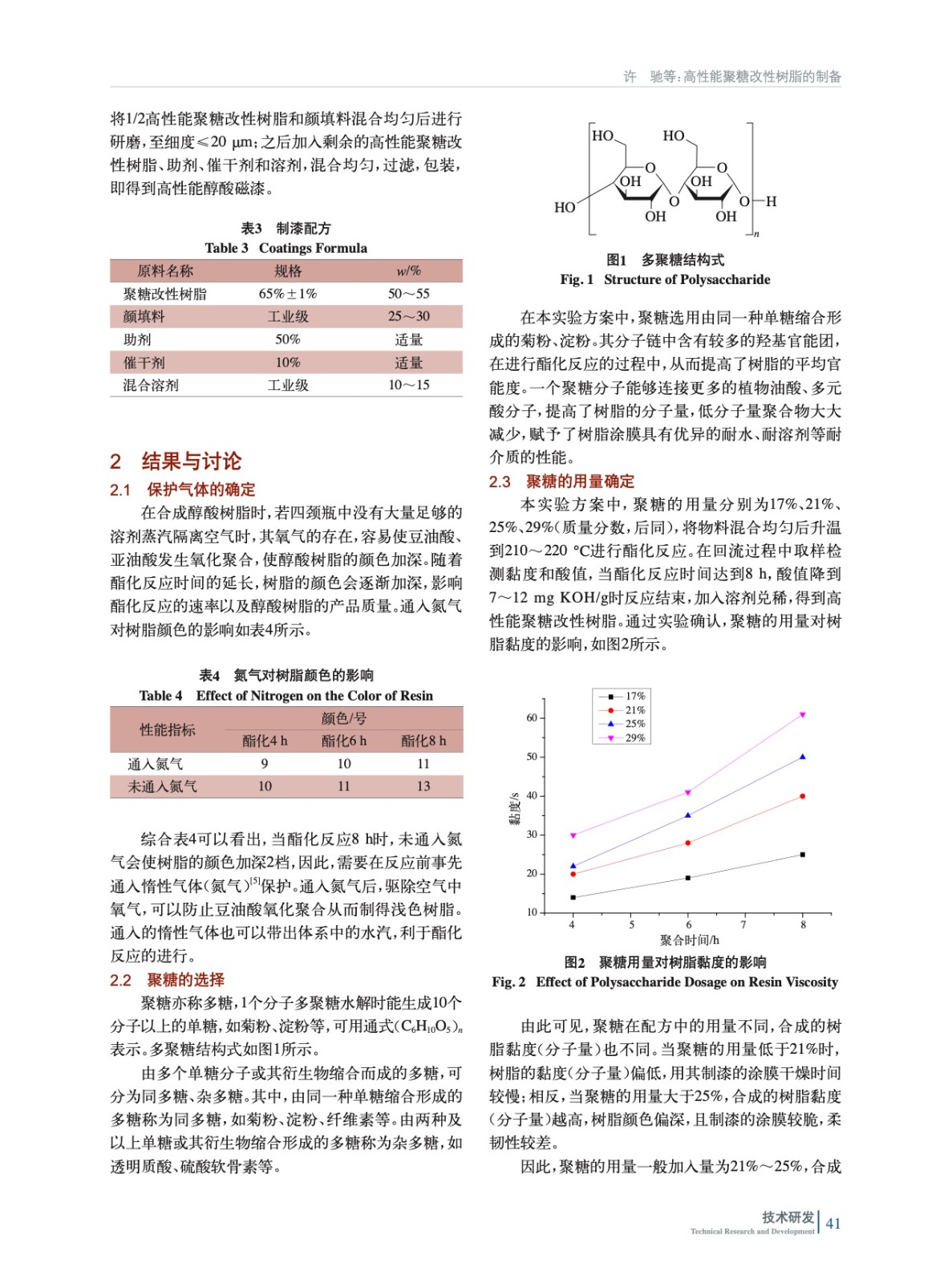摘要:以植物油酸、多元酸、聚糖、抗氧劑、溶劑等為原料,在氮氣保護下,升溫到210~220 ℃進行酯化反應,合成高性能聚糖改性樹脂,并用于制備磁漆。討論了各種工藝條件對樹脂性能的影響以及后期的制漆性能。結果表明:通過配方的設計,在氣體保護作用下,聚糖加入到醇酸樹脂的主鏈中,一個聚糖分子能夠連接更多的植物油酸、多元酸分子,低分子量聚合物大大減少。通過雙鍵的自動氧化聚合,涂膜的干性得到顯著提高且具有優異的耐介質、戶外曝曬性能。