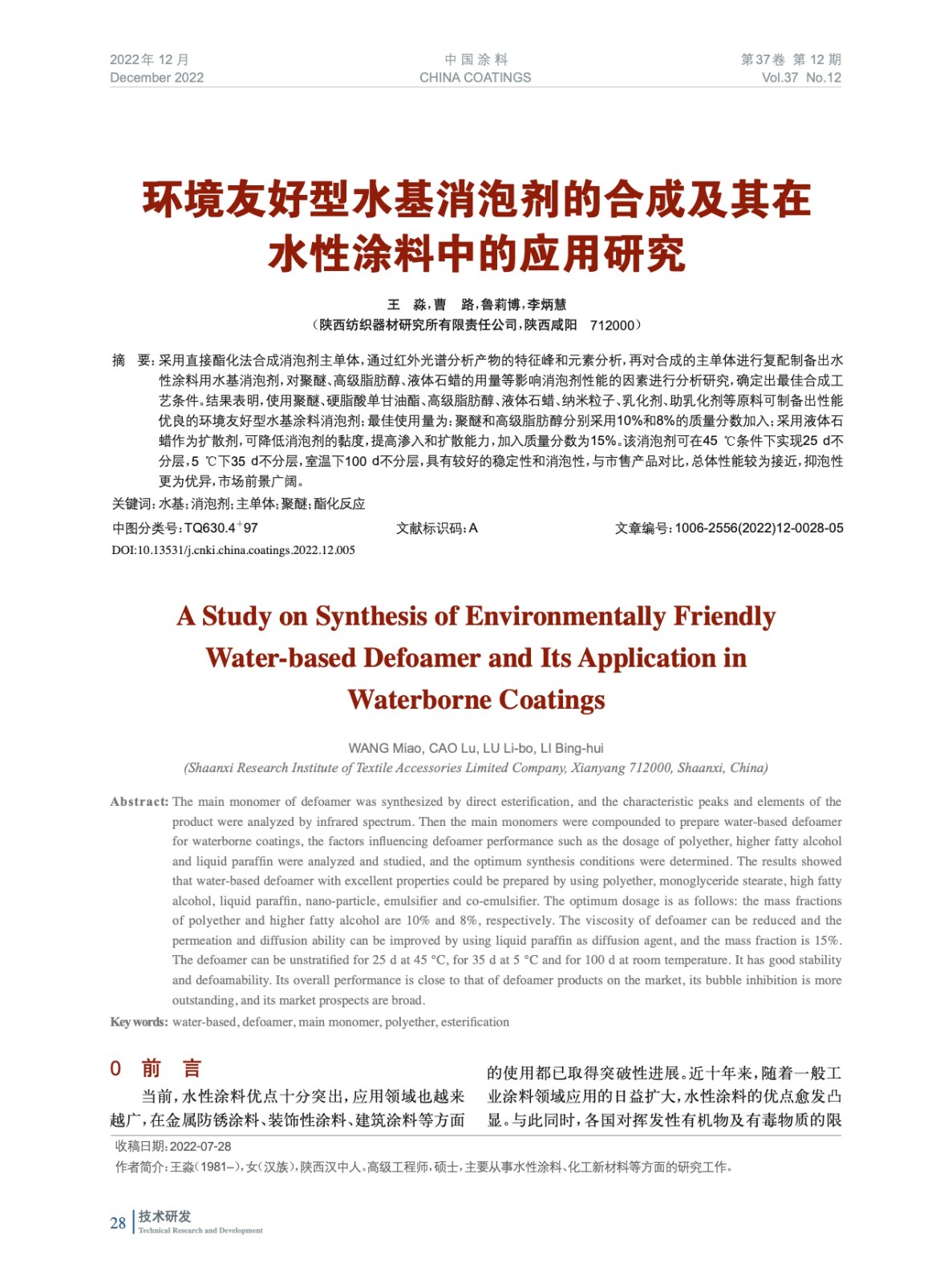 環境友好型水基消泡劑的合成及其在水性涂料中的應用研究