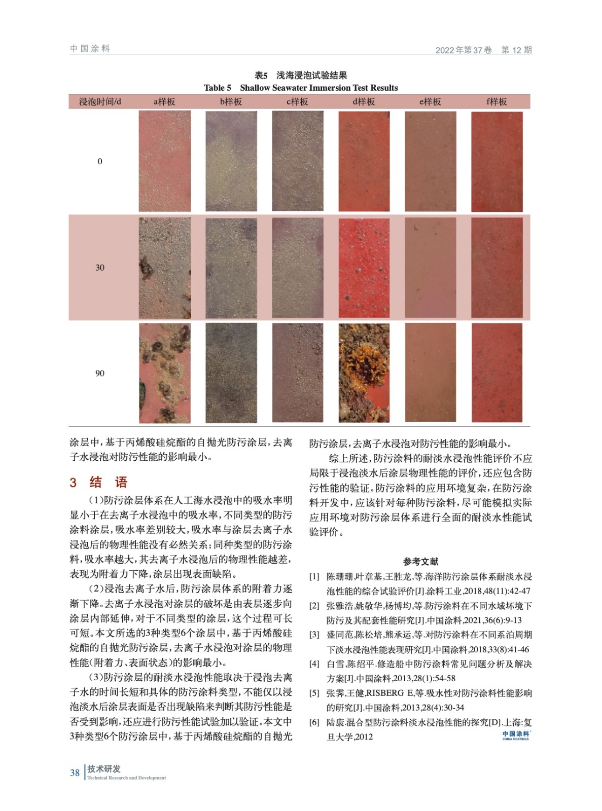 摘要:長期的淡水浸泡會對船舶防污涂層的性能產(chǎn)生影響,選取6種常見的市售防污涂料進行耐淡水浸泡性能研究。測量了涂層的吸水率,跟蹤了去離子水浸泡和室外干燥后涂層的附著力變化規(guī)律,通過淺海浸泡試驗考察了浸泡去離子水后涂層的防污性能,多角度對防污涂料的耐淡水浸泡性能進行研究,為防污涂料產(chǎn)品的開發(fā)應用提供參考。