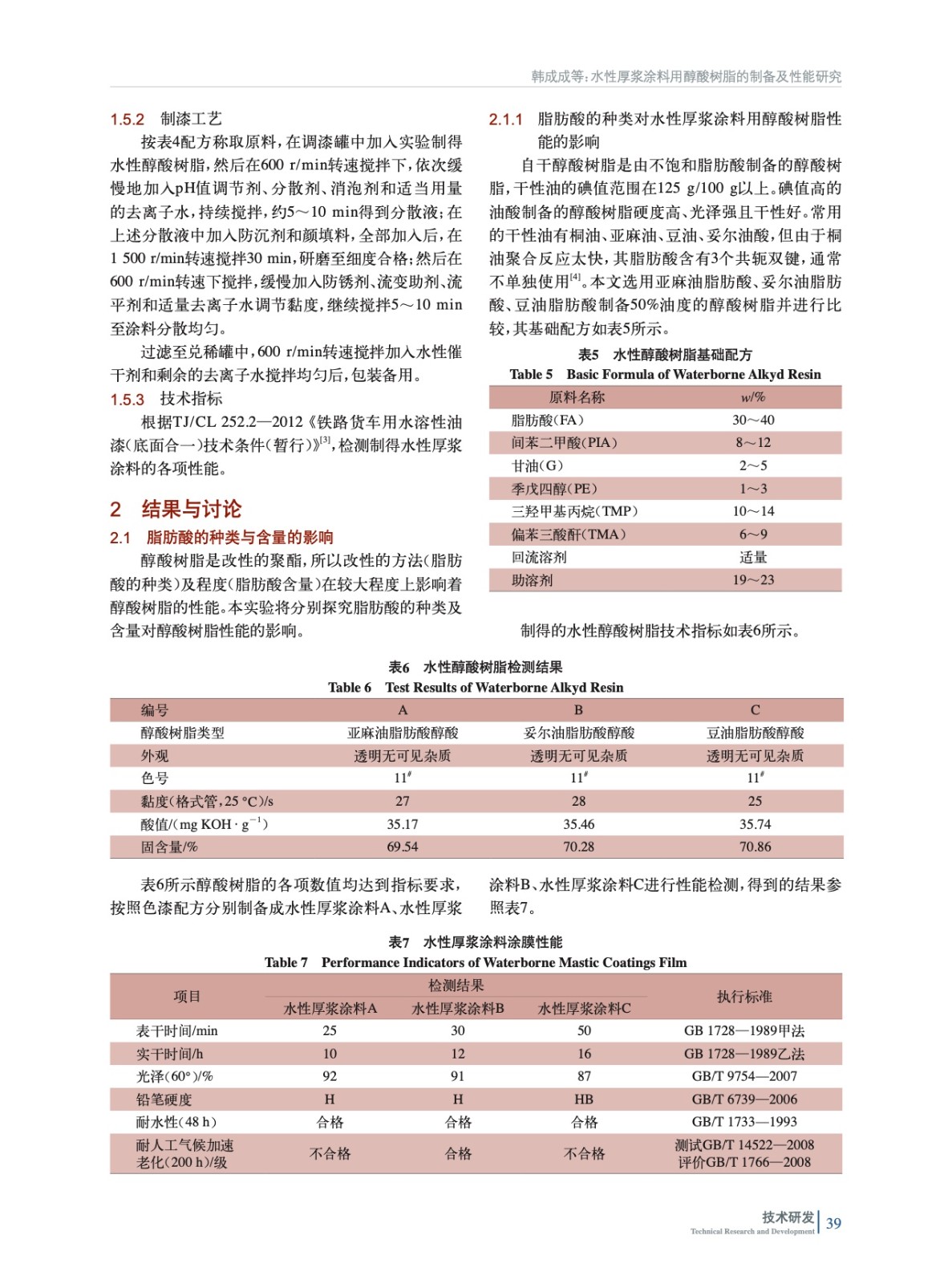 使用妥爾油脂肪酸制備合成水性厚漿涂料用醇酸樹脂,通過探究脂肪酸的種類及含量、酸性樹脂改性劑對叔丁基苯甲酸的用量及回流溶劑的選擇對水性醇酸樹脂的制備過程及產品性能指標的影響得出水性厚漿涂料用醇酸樹脂優化配方。