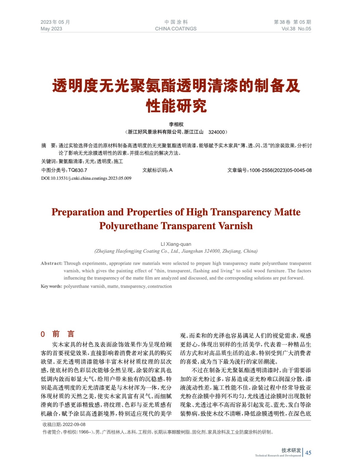 通過實驗選擇合適的原材料制備高透明度的無光聚氨酯透明清漆,能夠賦予實木家具“薄、透、閃、活”的涂裝效果,分析討論了影響無光涂膜透明性的因素,并提出相應的解決方法。