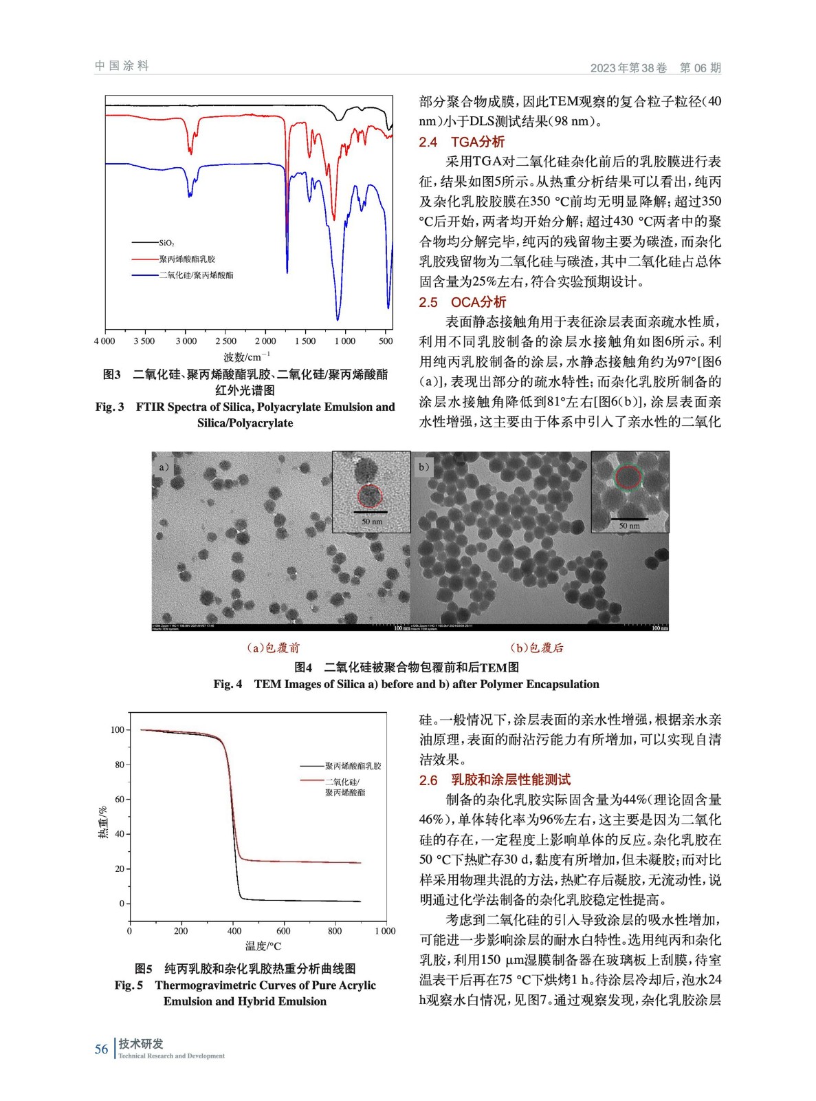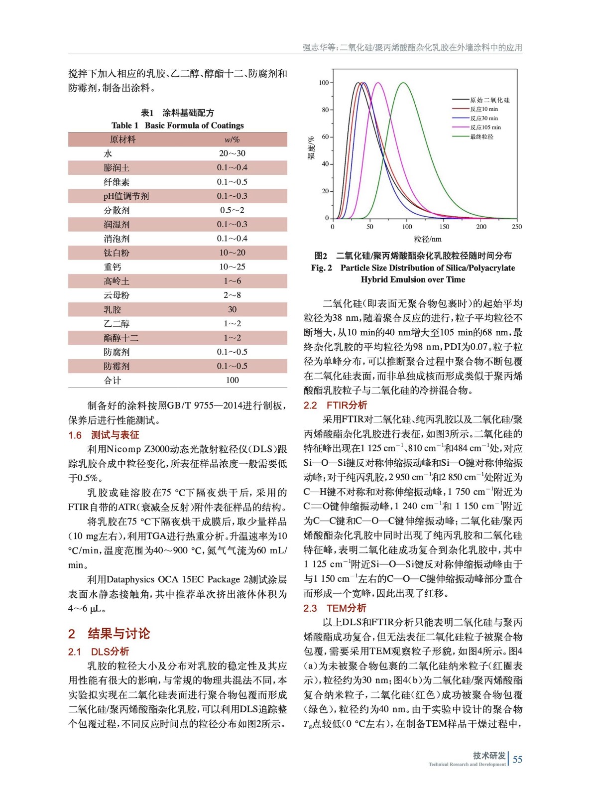 摘要:以二氧化硅為無機組分,甲基丙烯酸甲酯、丙烯酸丁酯、丙烯酸異辛酯為主單體,選擇合適的聚合工藝和配方,通過種子乳液半連續(xù)法合成二氧化硅/聚丙烯酸酯雜化乳膠,并應用于外墻涂料中,考察其基礎性能。通過傅里葉紅外光譜儀(FTIR)及透射電子顯微鏡(TEM)分析表明二氧化硅成功與聚丙烯酸酯復合,形成以二氧化硅為核,聚丙烯酸酯為殼的雜化乳膠。制備的雜化乳膠與純聚丙烯酸酯乳膠同時應用于外墻涂料中,通過接觸角測試(OCA)分析表明:雜化乳膠制備的涂層親水性更強,水接觸角為82°,純丙配方水接觸角為97°;參照外墻涂料標準GB/T 9755—2014,雜化乳膠制備的涂料耐沾污性為7%,相比純丙乳膠的14%有極大的提升,同時涂料的其他性能,如耐水性、耐堿性、耐洗刷性等均未出現(xiàn)異常劣化。