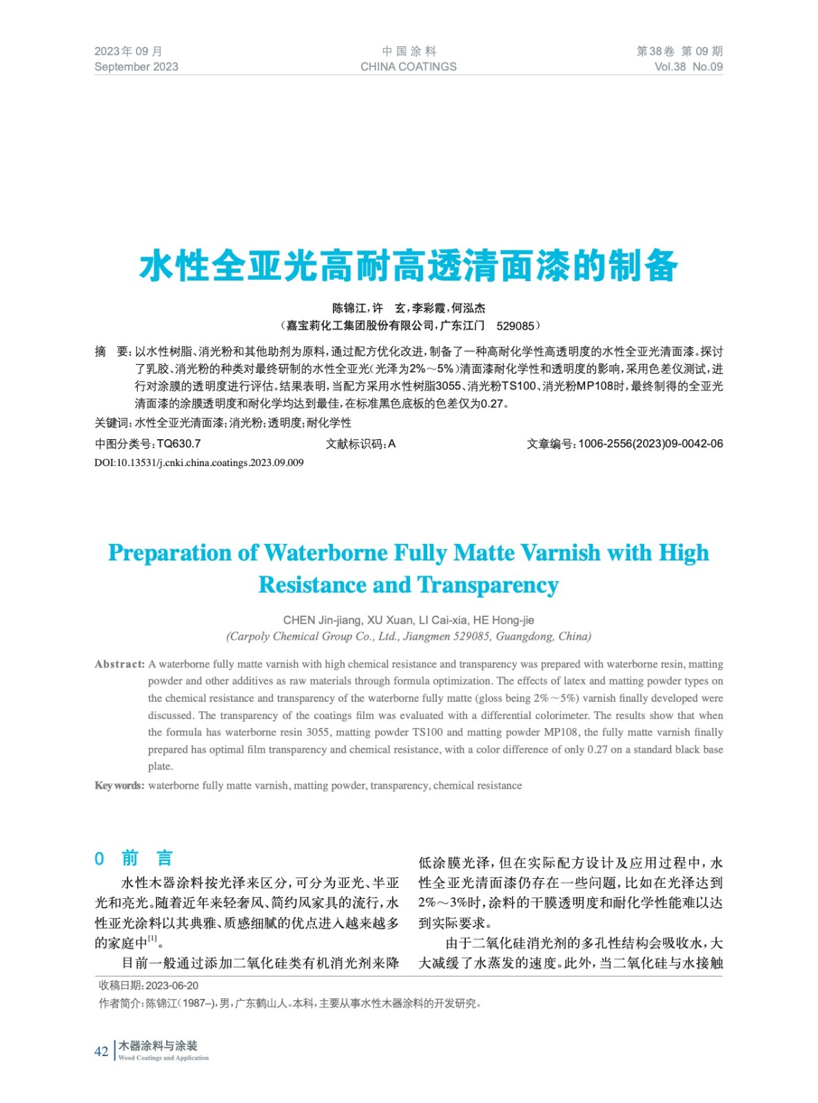 摘要:以水性樹脂、消光粉和其他助劑為原料,通過配方優化改進,制備了一種高耐化學性高透明度的水性全亞光清面漆。探討了乳膠、消光粉的種類對最終研制的水性全亞光(光澤為2%~5%)清面漆耐化學性和透明度的影響,采用色差儀測試,進行對涂膜的透明度進行評估。結果表明,當配方采用水性樹脂3055、消光粉TS100、消光粉MP108時,最終制得的全亞光清面漆的涂膜透明度和耐化學均達到最佳,在標準黑色底板的色差僅為0.27。