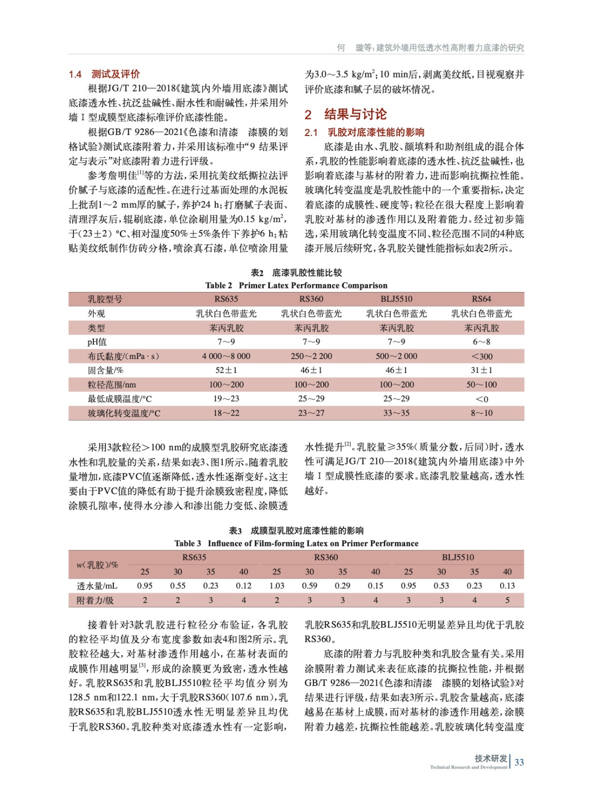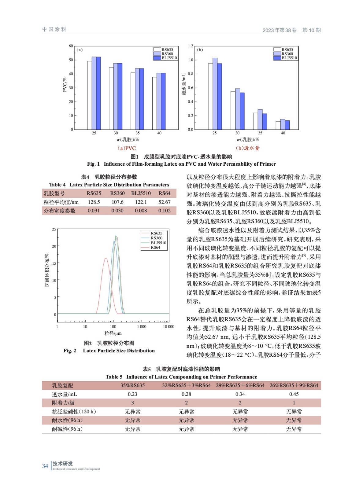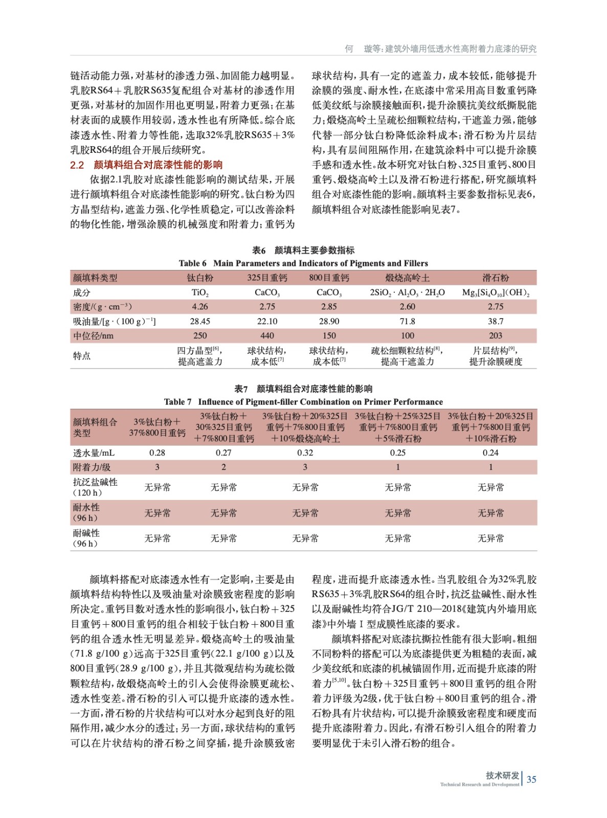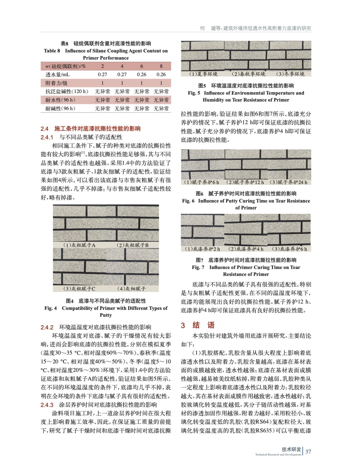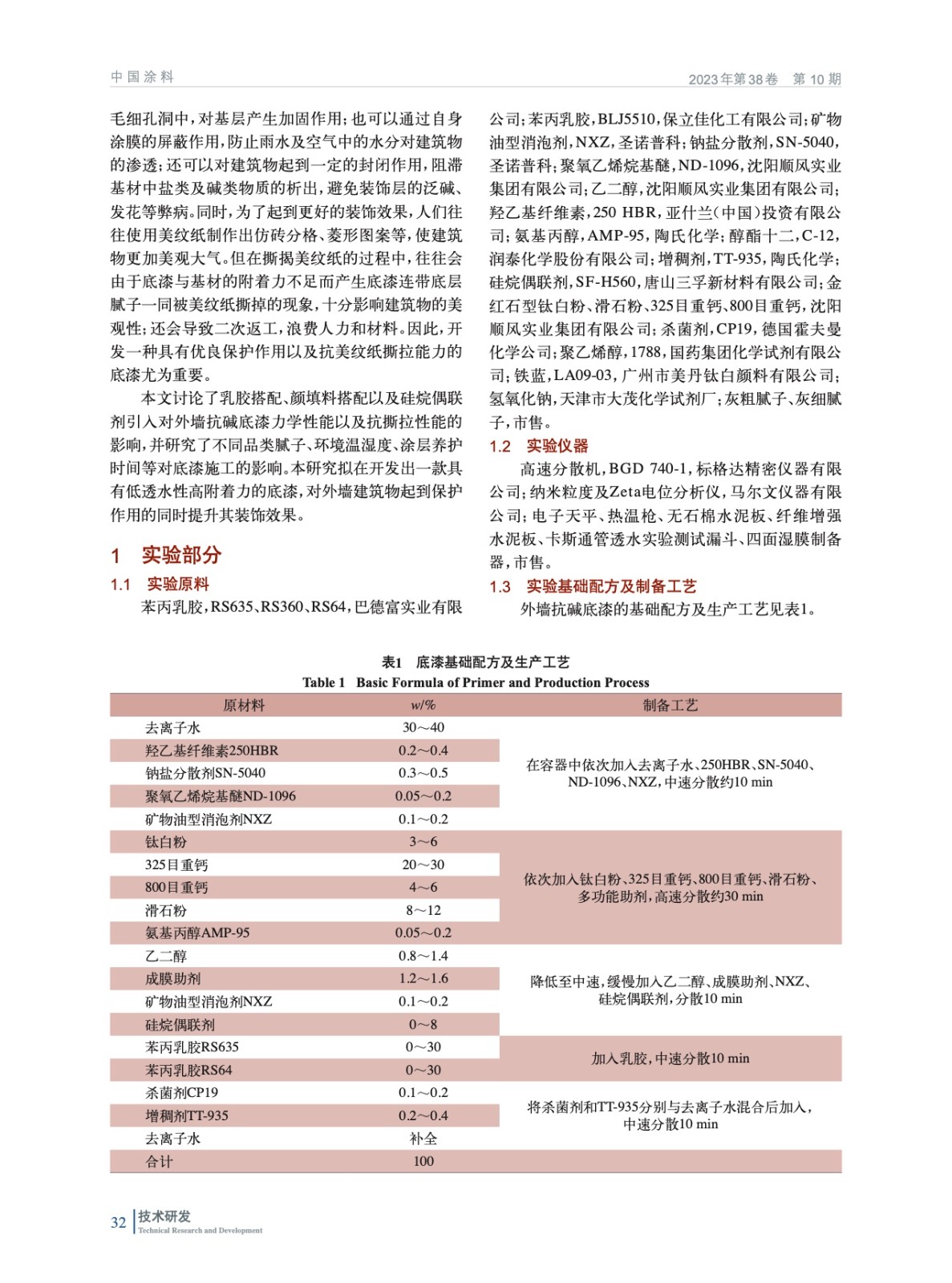 摘要:研究了乳膠搭配、顏填料搭配以及硅烷偶聯劑引入對底漆性能的影響,開發出低透水性高附著力外墻用底漆。結果表明:采用粒徑小、玻璃化轉變溫度低的乳膠復配粒徑大、玻璃化轉變溫度高的乳膠可以平衡底漆透水性和附著力,并提升其對基材的加固性能。采用粗細顏填料搭配可以降低底漆與美紋紙錨固面積,減弱美紋紙撕脫底漆風險;滑石粉的引入可以提升涂膜致密程度與硬度,提升底漆透水性與附著力。開發出的低透水性高附著力外墻用底漆在不同溫濕度環境下,均與灰粗膩子具有較強的適配性。