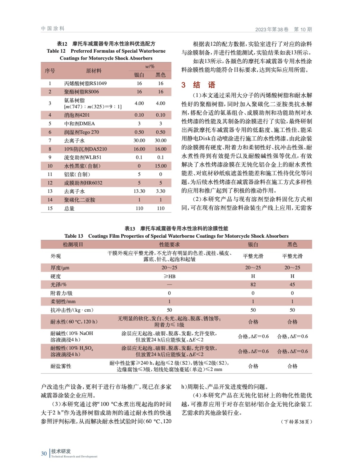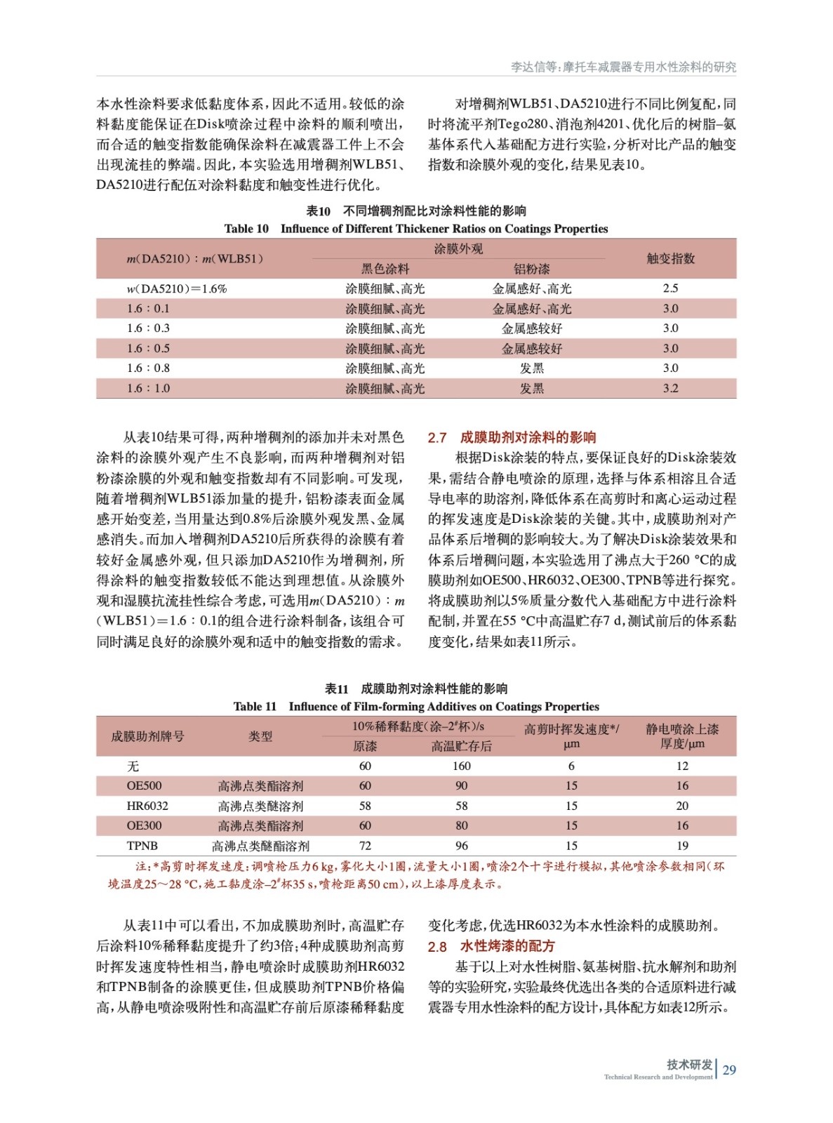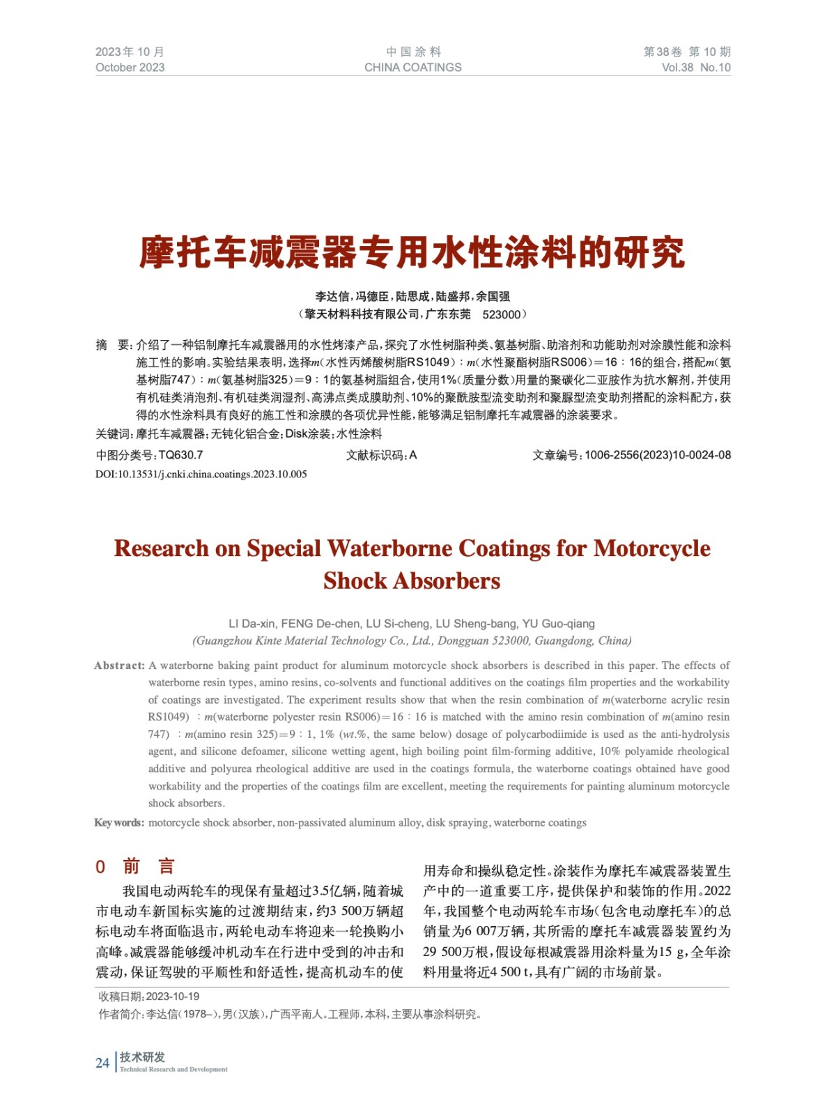 摘要:介紹了一種鋁制摩托車減震器用的水性烤漆產(chǎn)品,探究了水性樹脂種類、氨基樹脂、助溶劑和功能助劑對涂膜性能和涂料施工性的影響。實驗結果表明,選擇m(水性丙烯酸樹脂RS1049)∶m(水性聚酯樹脂RS006)=16∶16的組合,搭配m(氨基樹脂747)∶m(氨基樹脂325)=9∶1的氨基樹脂組合,使用1%(質(zhì)量分數(shù))用量的聚碳化二亞胺作為抗水解劑,并使用有機硅類消泡劑、有機硅類潤濕劑、高沸點類成膜助劑、10%的聚酰胺型流變助劑和聚脲型流變助劑搭配的涂料配方,獲得的水性涂料具有良好的施工性和涂膜的各項優(yōu)異性能,能夠滿足鋁制摩托車減震器的涂裝要求。