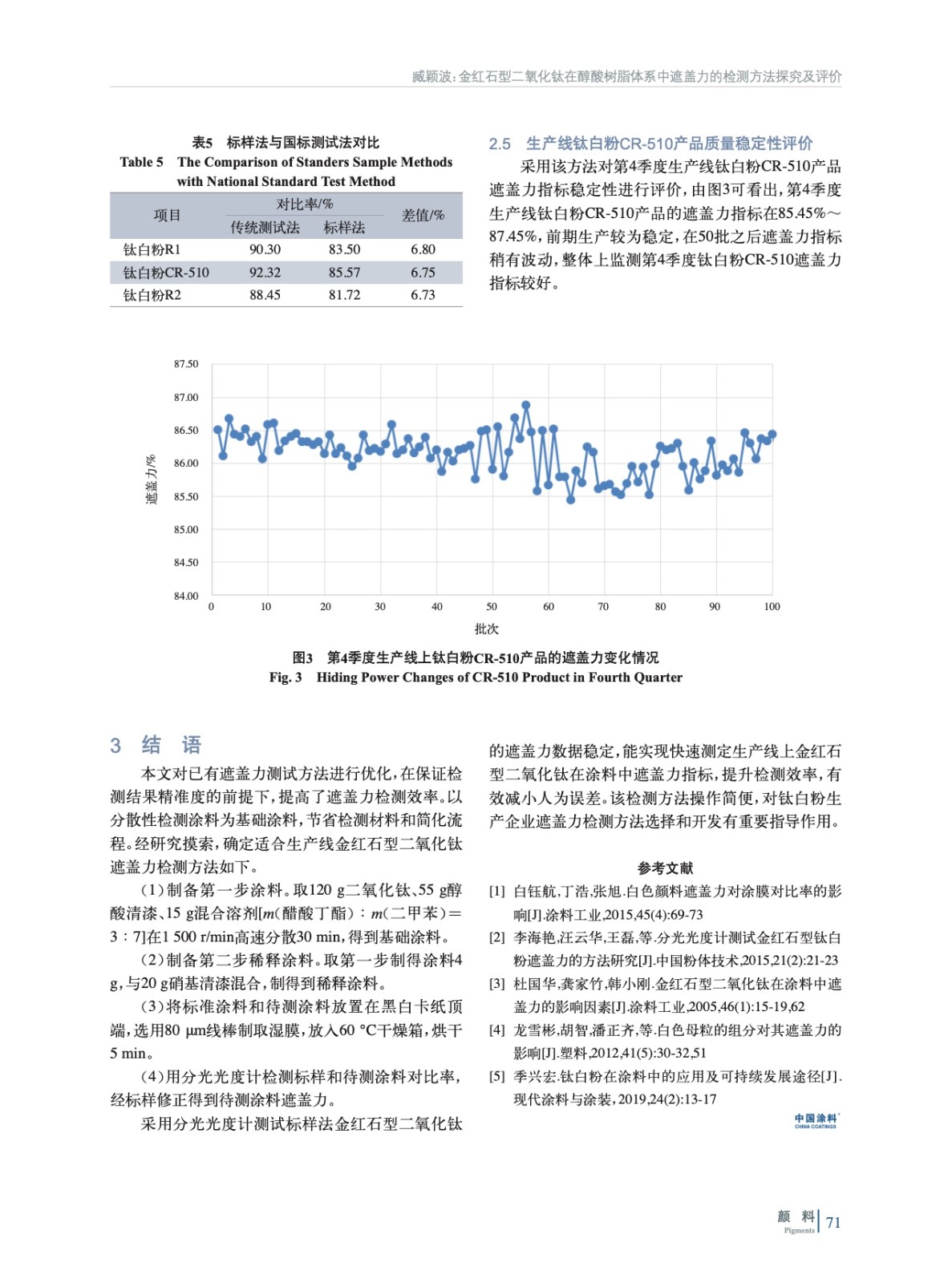 摘要:采用金紅石型二氧化鈦為顏料,按照一定的配方和方法制備涂料漿,取適量待測涂料漿和標樣涂料漿置于黑白板頂端,利用自動涂布機制備涂膜,采用分光光度計分別檢測黑白板上涂膜的反射率,得到其遮蓋力,同時對影響遮蓋力檢測的關鍵因素進行優化。結果表明,以醇酸樹脂、混合溶劑、硝基清漆、鈦白粉為原料制備涂料,濕膜厚度為80 μm的條件下,金紅石型二氧化鈦在醇酸樹脂中的遮蓋力數值穩定,數據重塑性好。采用該種方法可實現生產線鈦白粉質量穩定性評價。