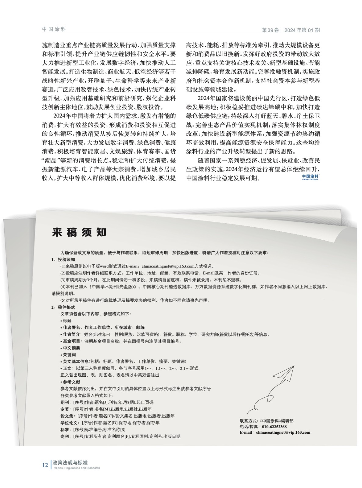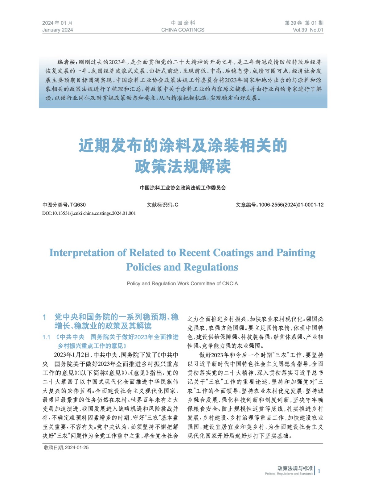 摘要:剛剛過去的2023年,是全面貫徹黨的二十大精神的開局之年,是三年新冠疫情防控轉段后經濟恢復發展的一年。我國經濟波浪式發展、曲折式前進,呈現前低、中高、后穩態勢,15660成績可圈可點,經濟社會發展主要預期目標圓滿實現。中國涂料工業協會政策法規工作委員會將2023年國家和地方出臺的與涂料和涂裝相關的政策法規進行了梳理和匯總,將政策中關于涂料工業的內容原文摘錄,并由行業內的專家進行了解讀,以便行業同仁及時掌握政策動態和要點,從而精準把握機遇,實現穩定向好發展。