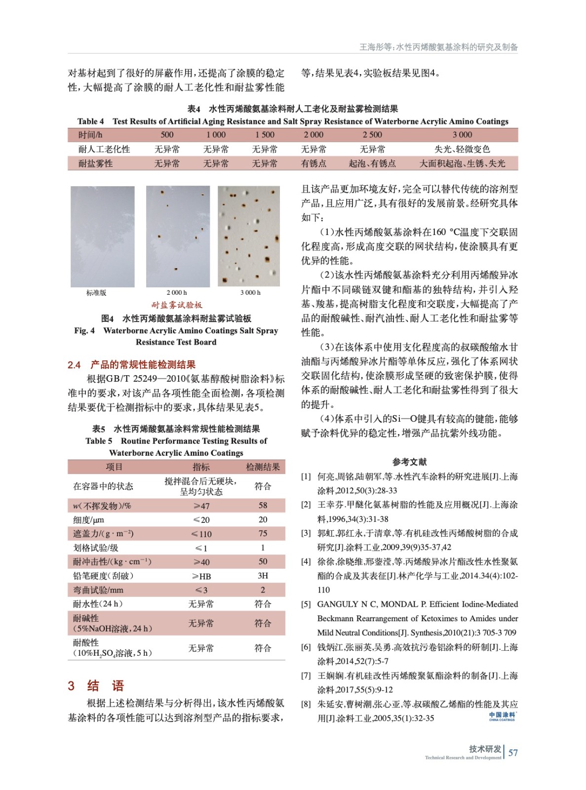 摘要:通過使用丙烯酸異冰片酯、甲基丙烯酸羥丙酯、叔碳酸縮水甘油酯等性能優(yōu)異單體合成水性羥基丙烯酸樹脂,并在體系中引入Si—O鍵,進(jìn)而與氨基樹脂在一定溫度下交聯(lián)固化,可以使涂膜形成高度交聯(lián)的網(wǎng)狀結(jié)構(gòu),進(jìn)而形成致密的保護(hù)涂層,涂層具有優(yōu)良的耐化學(xué)品性、耐酸堿性、耐人工老化性、耐鹽霧性等。