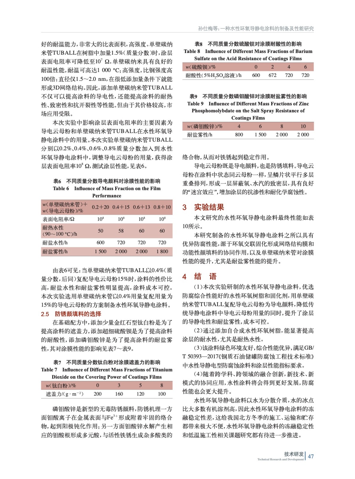 摘要:討論了水性環(huán)氧樹脂、固化劑、導(dǎo)電顏料和防銹顏料對涂層性能影響,擬通過導(dǎo)電云母粉復(fù)配單壁碳納米管為導(dǎo)電顏料,制備一種水性環(huán)氧導(dǎo)靜電涂料。實(shí)驗(yàn)結(jié)果表明,制備的水性環(huán)氧導(dǎo)靜電涂料綜合性能優(yōu)異,滿足GB/T 50393—2017中對水性導(dǎo)靜電型防腐蝕涂料和涂層性能指標(biāo)要求。