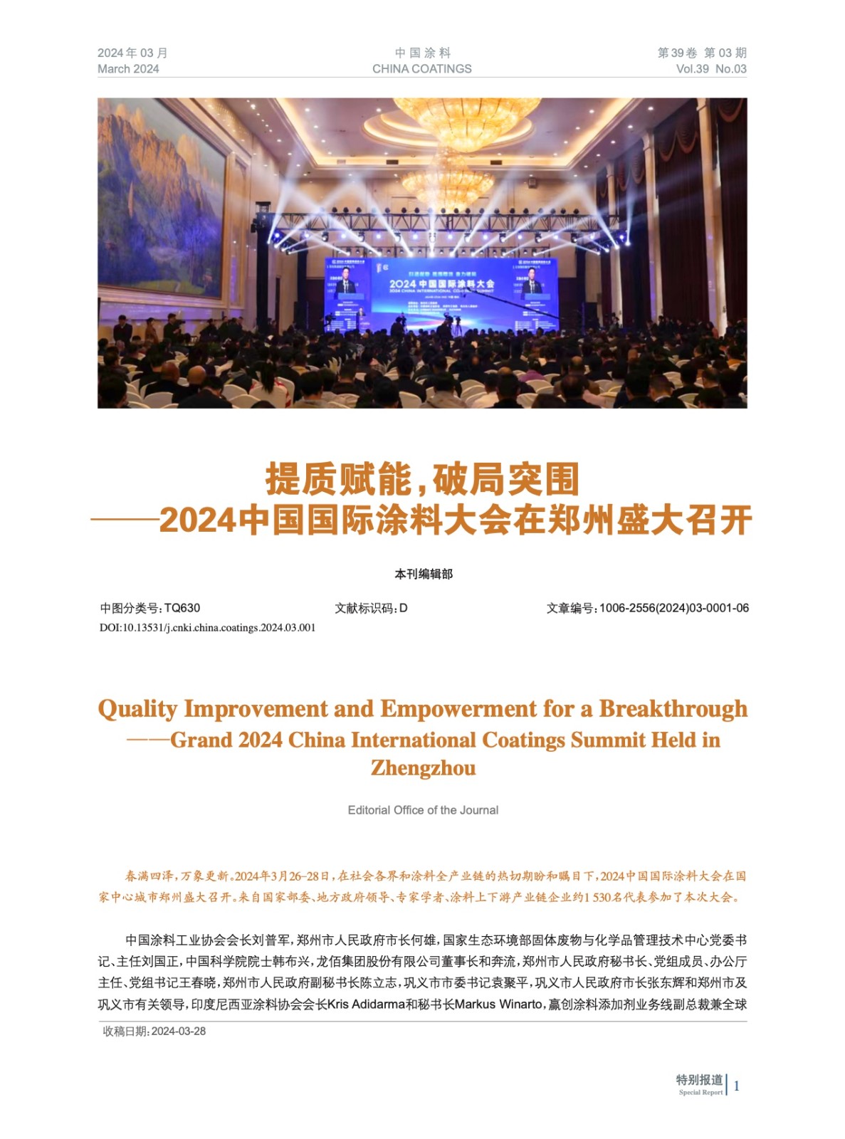 編者按:春滿四澤,萬象更新。2024年3月26-28日,在社會各界和涂料全產業鏈的熱切期盼和矚目下,2024中國國際涂料大會在國家中心城市鄭州盛大召開。來自國家部委、地方政府領導、專家學者、涂料上下游產業鏈企業約1 530名代表參加了本次大會。