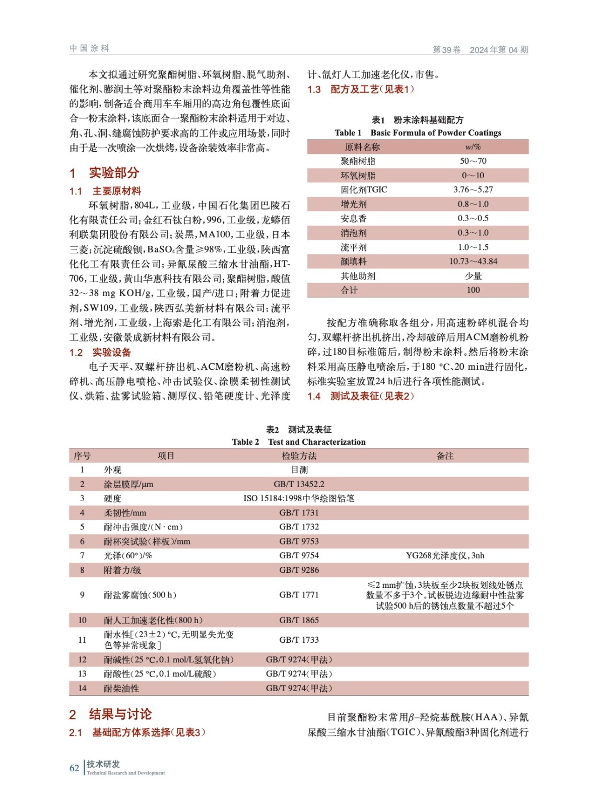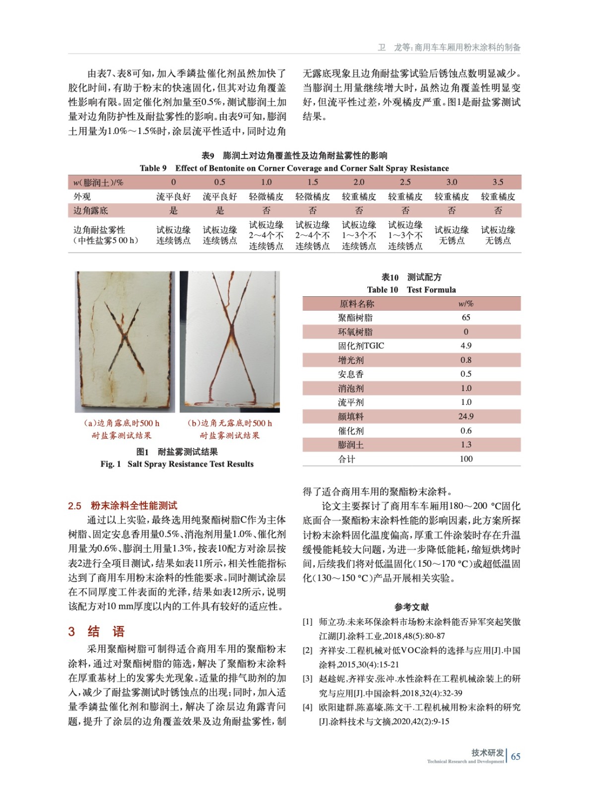 摘要:針對商用車作業(yè)環(huán)境和使用要求、工件特點,通過對樹脂、助劑等的選擇,探討了環(huán)氧樹脂、脫氣劑對涂層外觀、光澤、耐鹽霧性能的影響,并通過測試催化劑及膨潤土對粉末涂層邊角覆蓋性的影響,制備了適合商用車車廂用粉末涂料,配方中各助劑最佳用量(質(zhì)量分?jǐn)?shù))為安息香0.5%、消泡劑1.0%、催化劑0.6%、膨潤土1.3%。