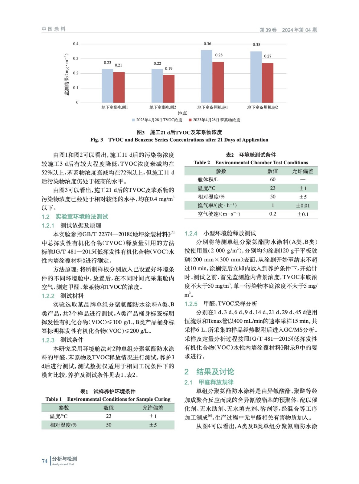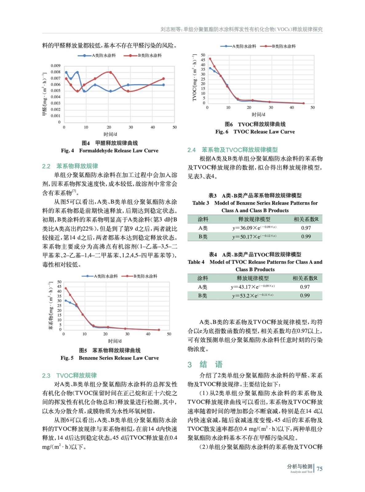 摘要:選取了目前工程上常用的單組分聚氨酯防水涂料作為測試對象,應用環境艙法測試試樣45 d的揮發性有機化合物(VOCs)釋放規律。實驗結果表明,所選試樣的揮發性有機化合物(VOCs)釋放速率隨著時間的延長而降低,在14 d內快速衰減,45 d時有害物質的釋放速率處于較低水平。此研究對于指導工程現場單組分聚氨酯防水涂料的施工及保障室內空氣質量提供了數據支撐。苯系物及TVOC釋放規律符合指數模型y=A×e(-B×x)。