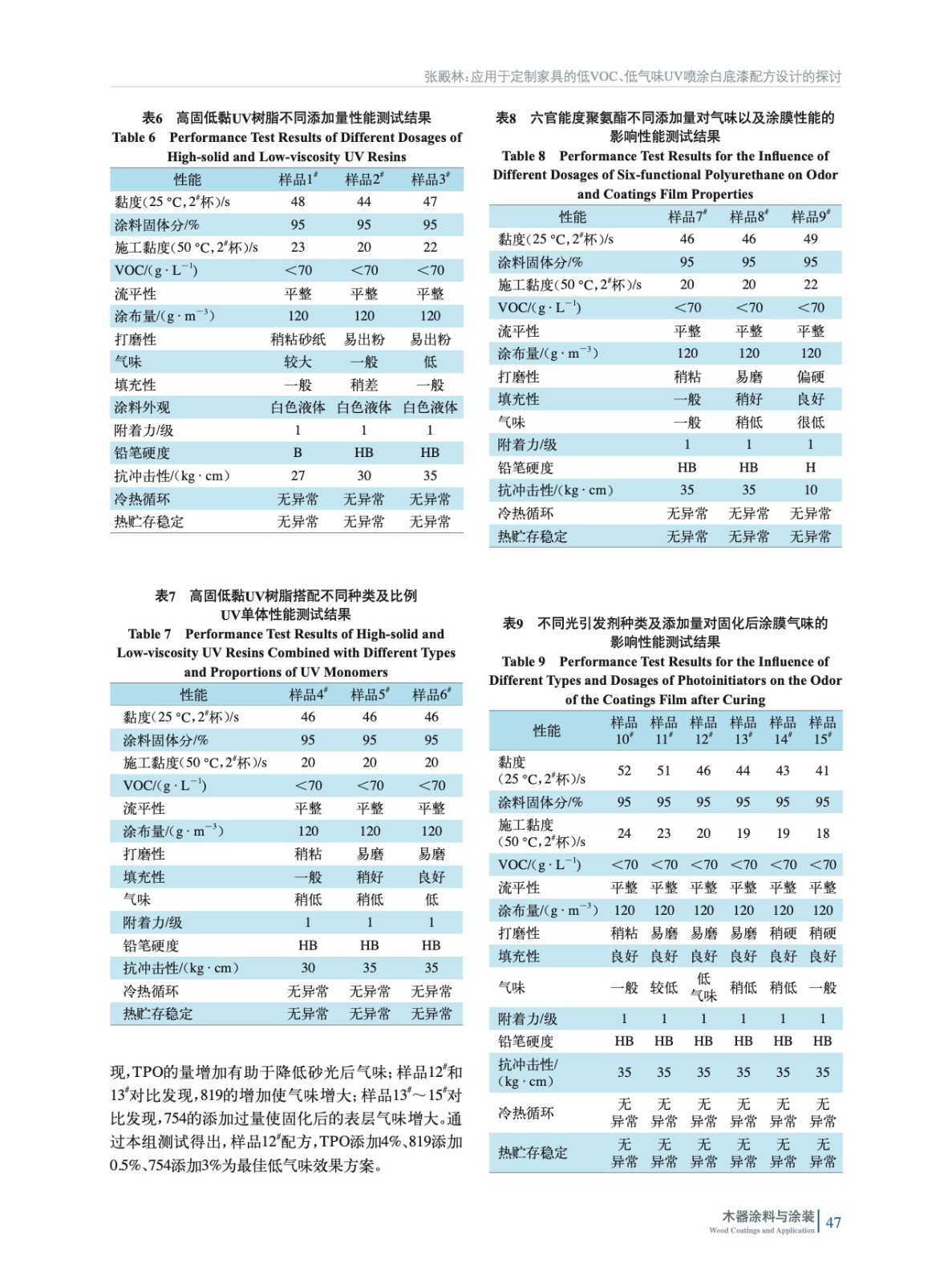 摘要:主要通過使用高固低黏的UV樹脂搭配UV單體減少有機(jī)溶劑添加量,以及添加一定比例的高官能度聚氨酯和深層光引發(fā)劑來實現(xiàn)深層固化的交聯(lián)密度,通過對光引發(fā)劑的復(fù)配與不同比例的添加,來進(jìn)一步降低固化后氣味。同時對層間連涂測試以及在配方設(shè)計時遇到的一些其他需要注意事項做了介紹。