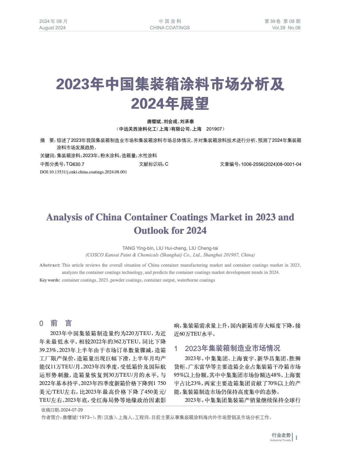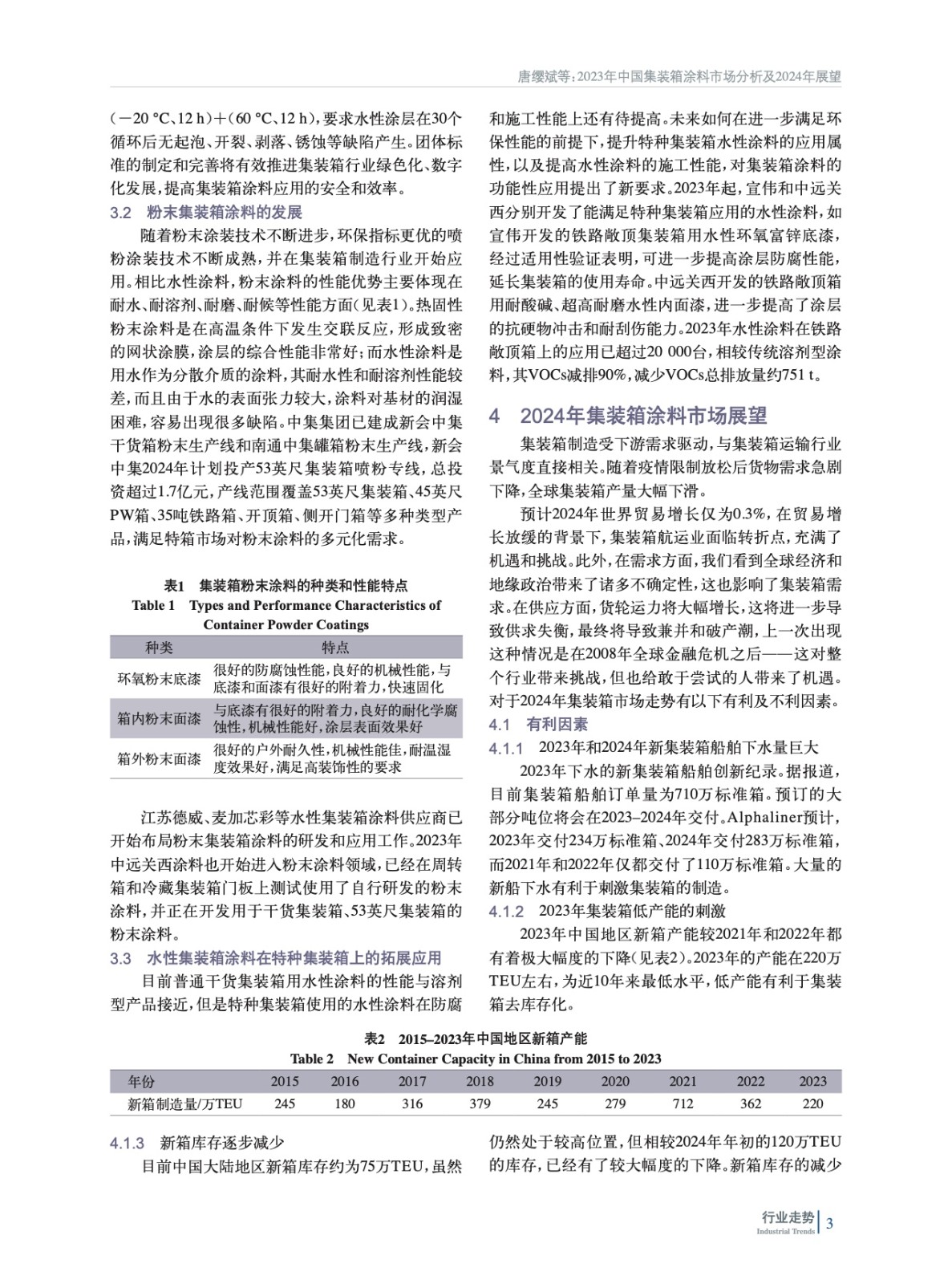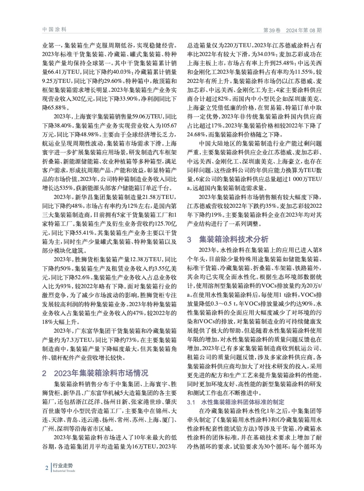 綜述了2023年我國集裝箱制造業市場和集裝箱涂料市場總體情況,并對集裝箱涂料技術進行分析,預測了2024年集裝箱涂料市場發展趨勢。
