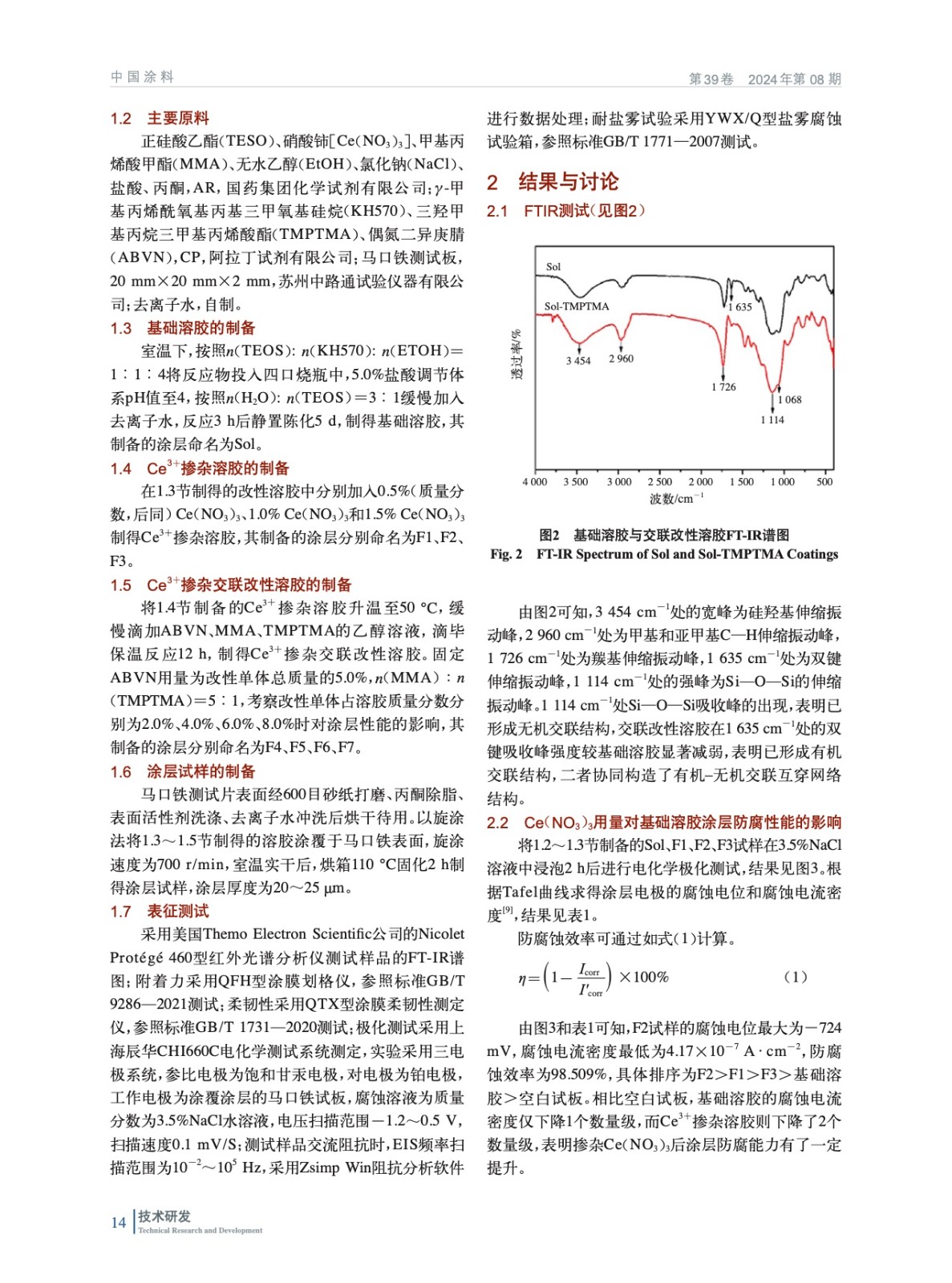 具有互穿網絡結構的Ce3+摻雜硅溶膠涂層及其防腐性能研究
