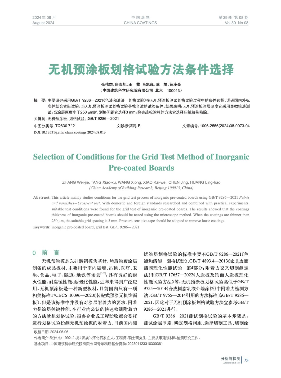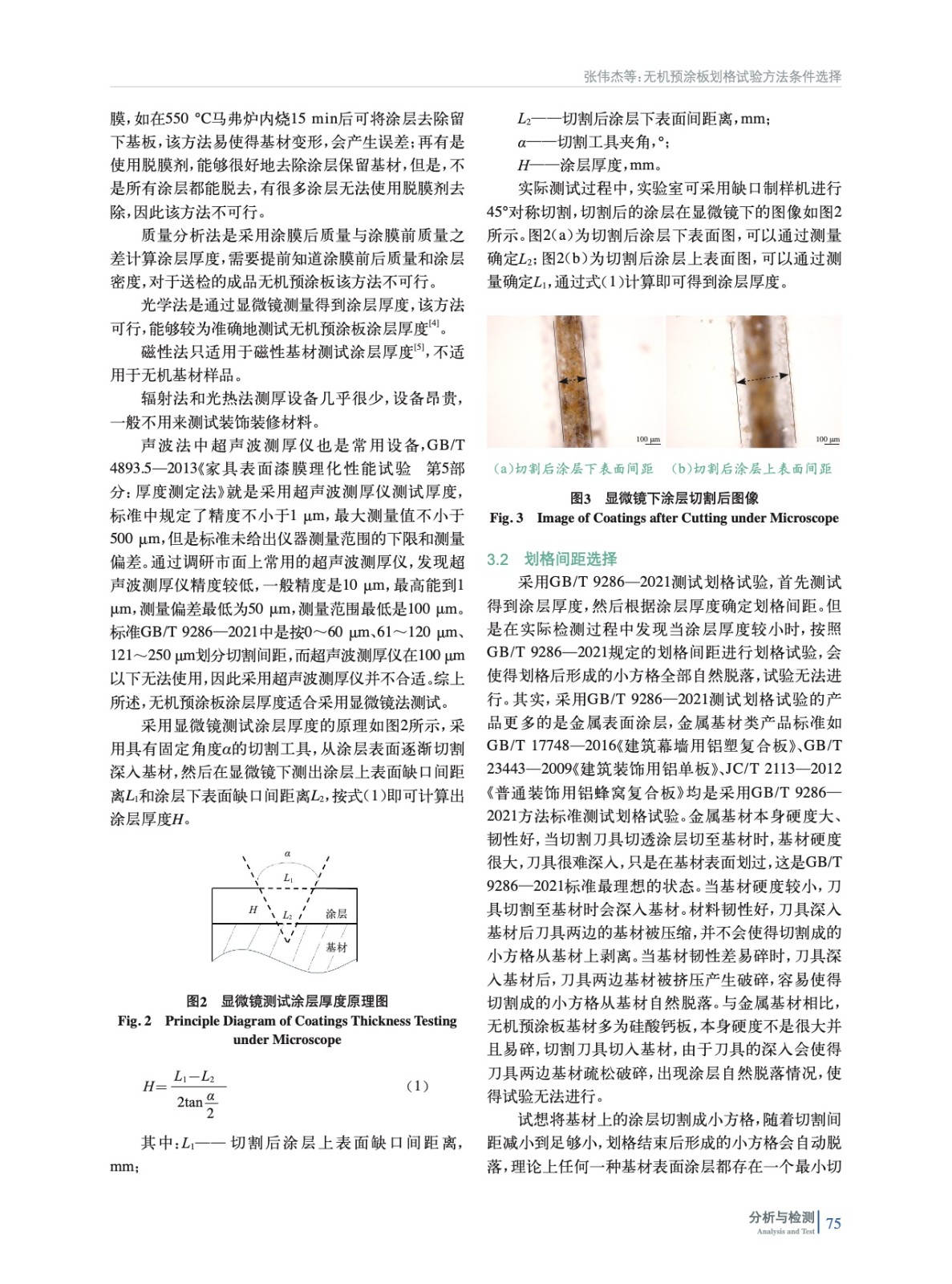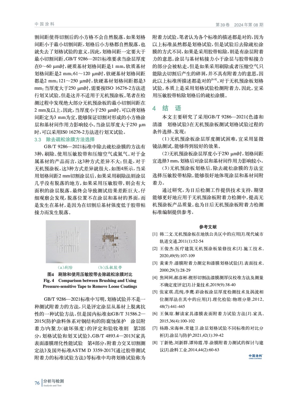 摘要:主要研究采用GB/T 9286—2021《色漆和清漆 劃格試驗(yàn)》在無機(jī)預(yù)涂板測(cè)試劃格試驗(yàn)過程中的條件選擇。調(diào)研國(guó)內(nèi)外標(biāo)準(zhǔn)并結(jié)合實(shí)際試驗(yàn),為無機(jī)預(yù)涂板測(cè)試劃格試驗(yàn)尋找合適的試驗(yàn)條件。結(jié)果表明:無機(jī)預(yù)涂板涂層厚度宜采用顯微鏡法測(cè)試;當(dāng)涂層厚度小于250 μm時(shí),劃格間距宜選擇3 mm;除去疏松涂膜的方法宜選擇壓敏膠帶粘除。