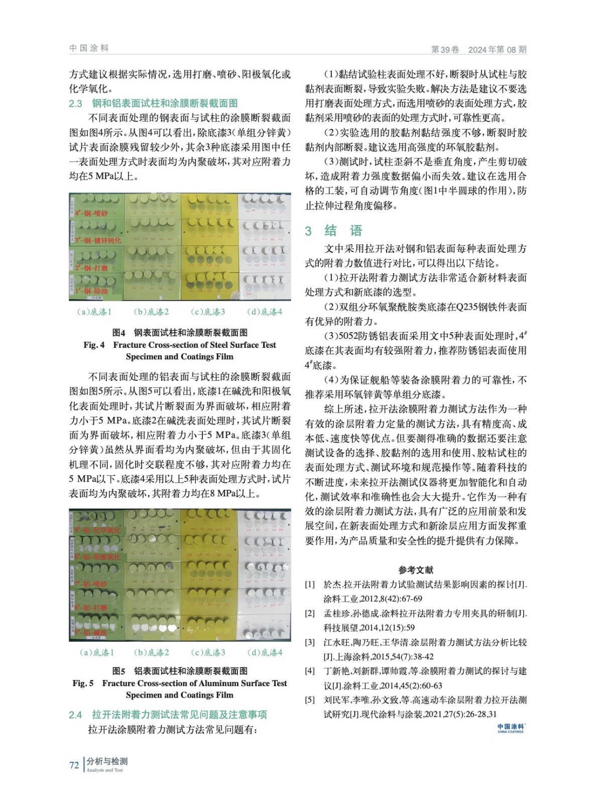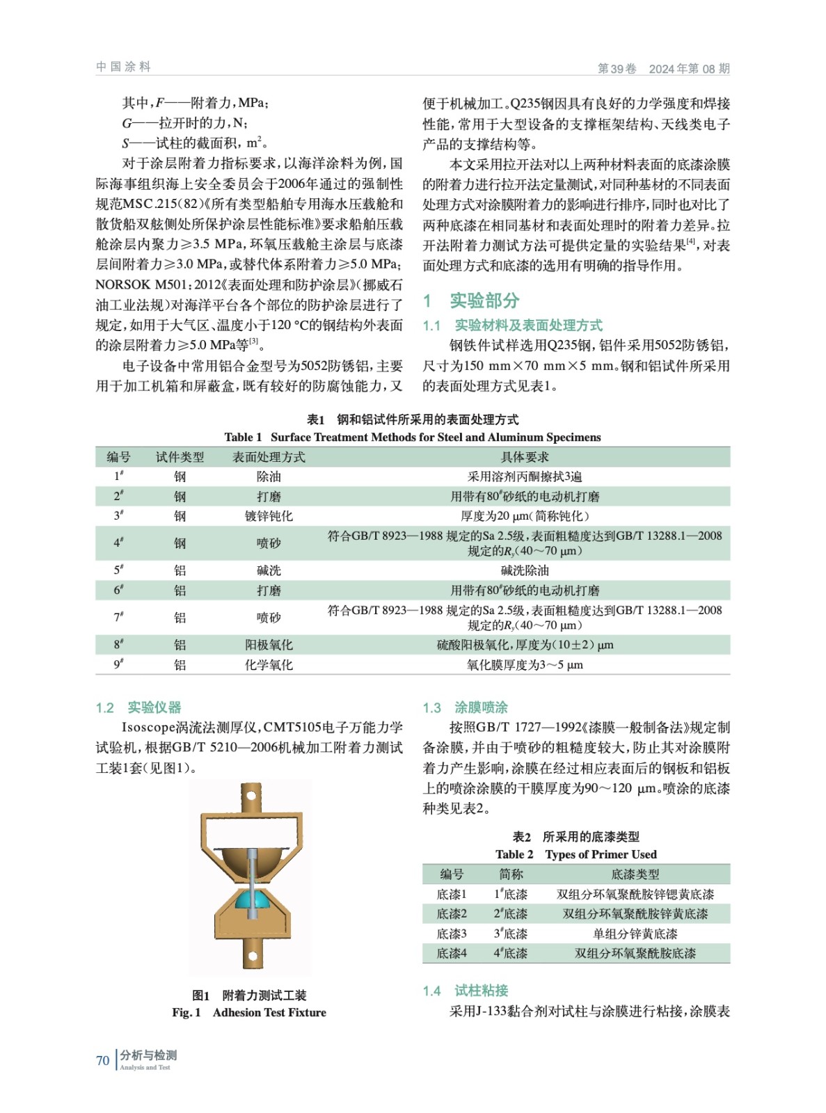 摘要:采用拉開法對艦載電子裝備上常用的Q235鋼和5052防銹鋁表面的底漆涂膜的附著力進行拉開法定量測試,對同種基材的不同表面處理方式對同種底漆涂膜附著力的影響進行比較,同時也對比了4種底漆在相同基材和表面處理時的附著力差異。通過拉開后的截面圖和底漆本身的特性解釋了附著力差異的原因,給出了Q235鋼和5052防銹鋁表面不同表面處理方式時的底漆選用建議。