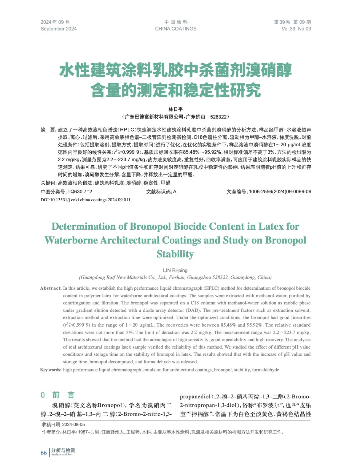 水性建筑涂料乳膠中殺菌劑溴硝醇含量的測定和穩(wěn)定性研究